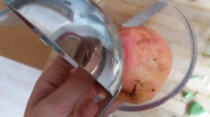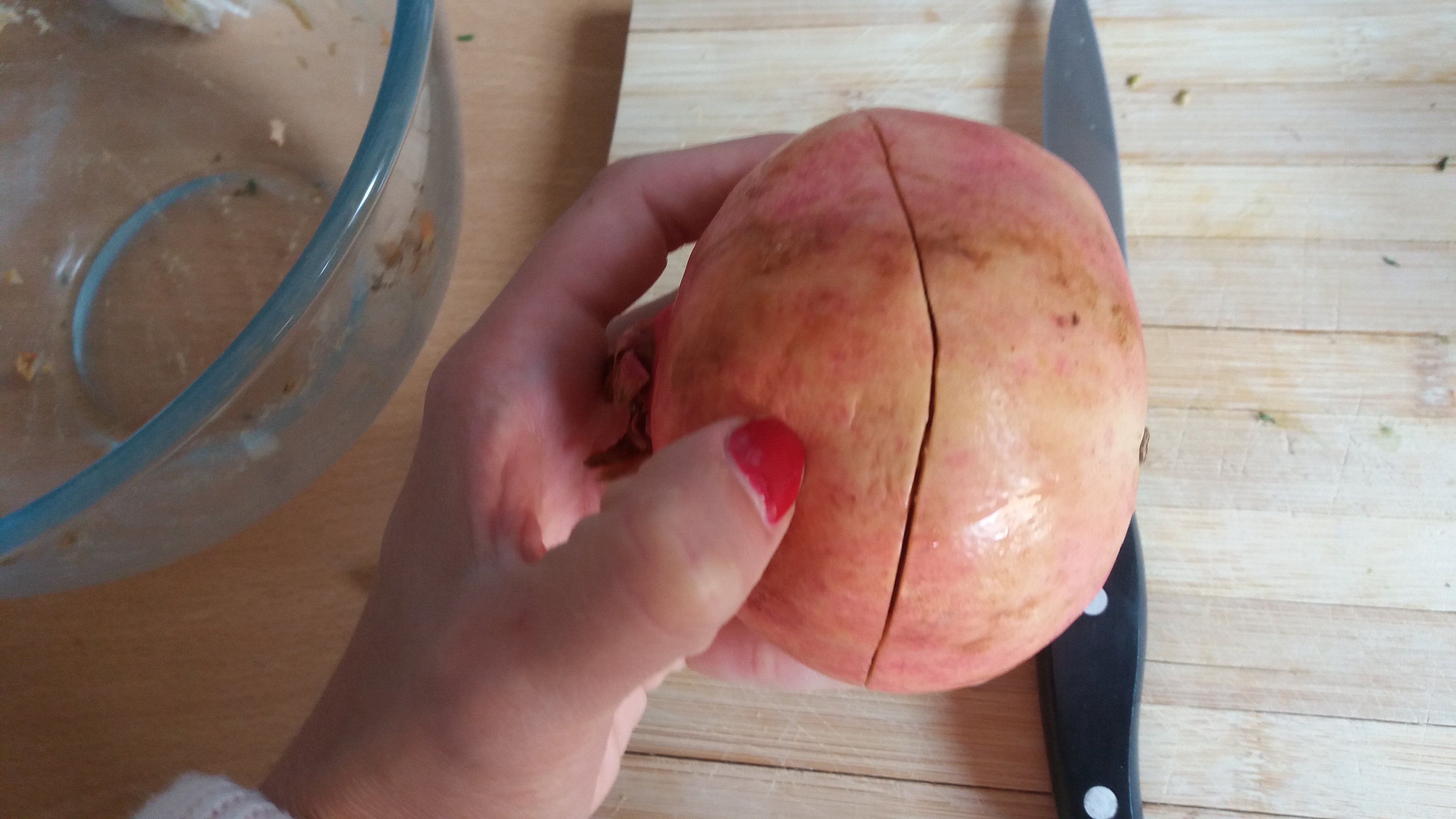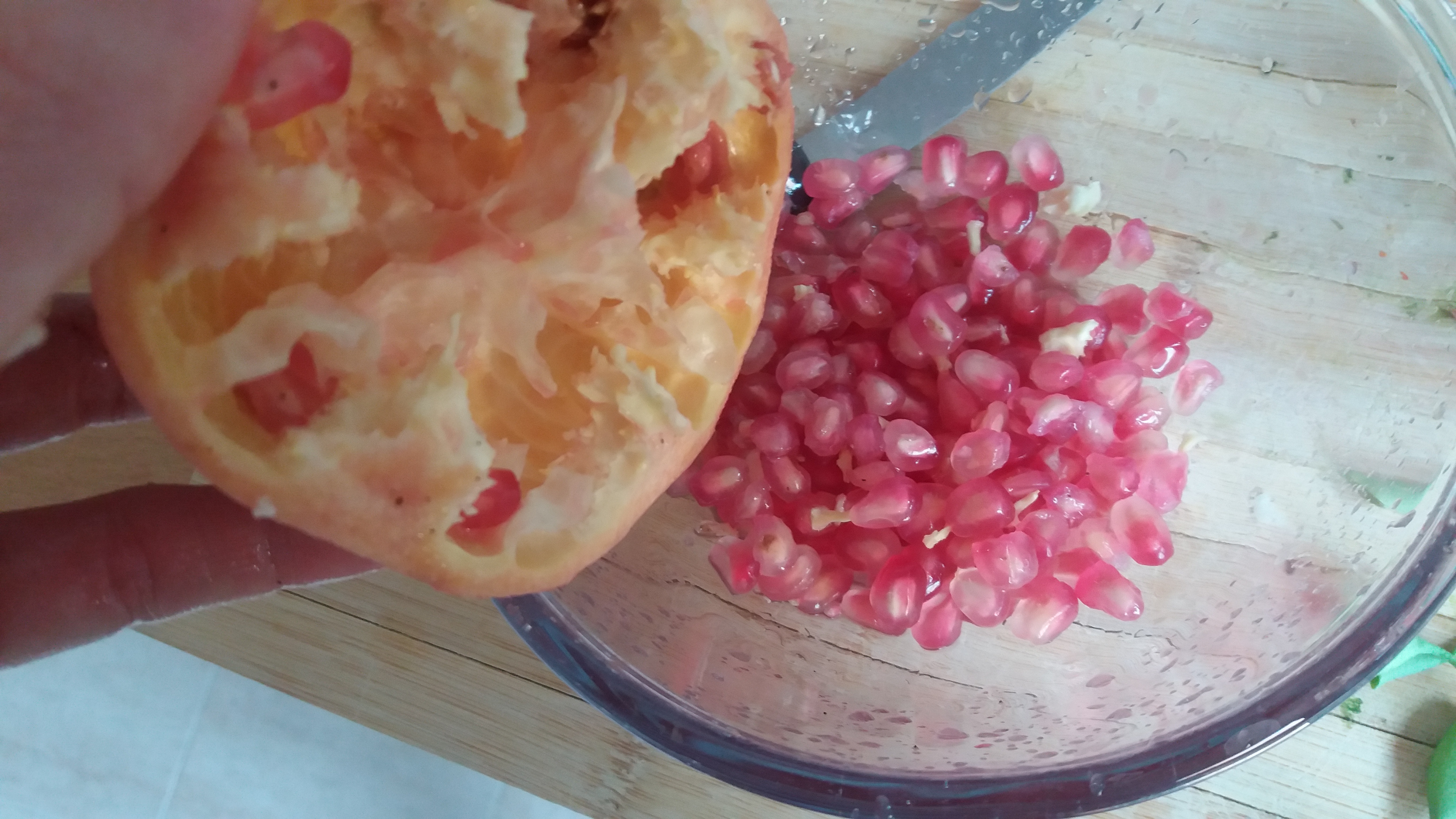 Continuamos desgranando la granada. Os voy a enseñar un truco infalible que os hará cambiar vuestra forma de mirar a las granadas en el supermercado (me refiero a esa forma de mirarlas pensando «sísí, qué rica estas pero anda que no eres engorrosa de sacar!»). Simplemente debemos cortar la granada por la mitad y golpearla por detrás con un cazo de servir fuertemente, poniendo debajo la ensaladera donde estaba la kale. Veréis que los granitos caen solos!