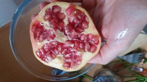 ¿Sabíais que la granada es una de las frutas con más cantidad y variedad de antioxidantes? Sin meterme en demasiados detalles, los antioxidantes son sustancias que luchan contra la acción de los radicales libres (los causantes del envejecimiento celular) que tanto abundan en nuestro entorno. Los frutos rojos en general tienen un contenido muy potente (por ello están «tan de moda» y los vemos tanto en dietas detox, batidos etc). Además, la granada tiene la particularidad de que es de las pocas frutas que se recomienda a diabéticos, dado que tiene un índice glucémico muy bajo.