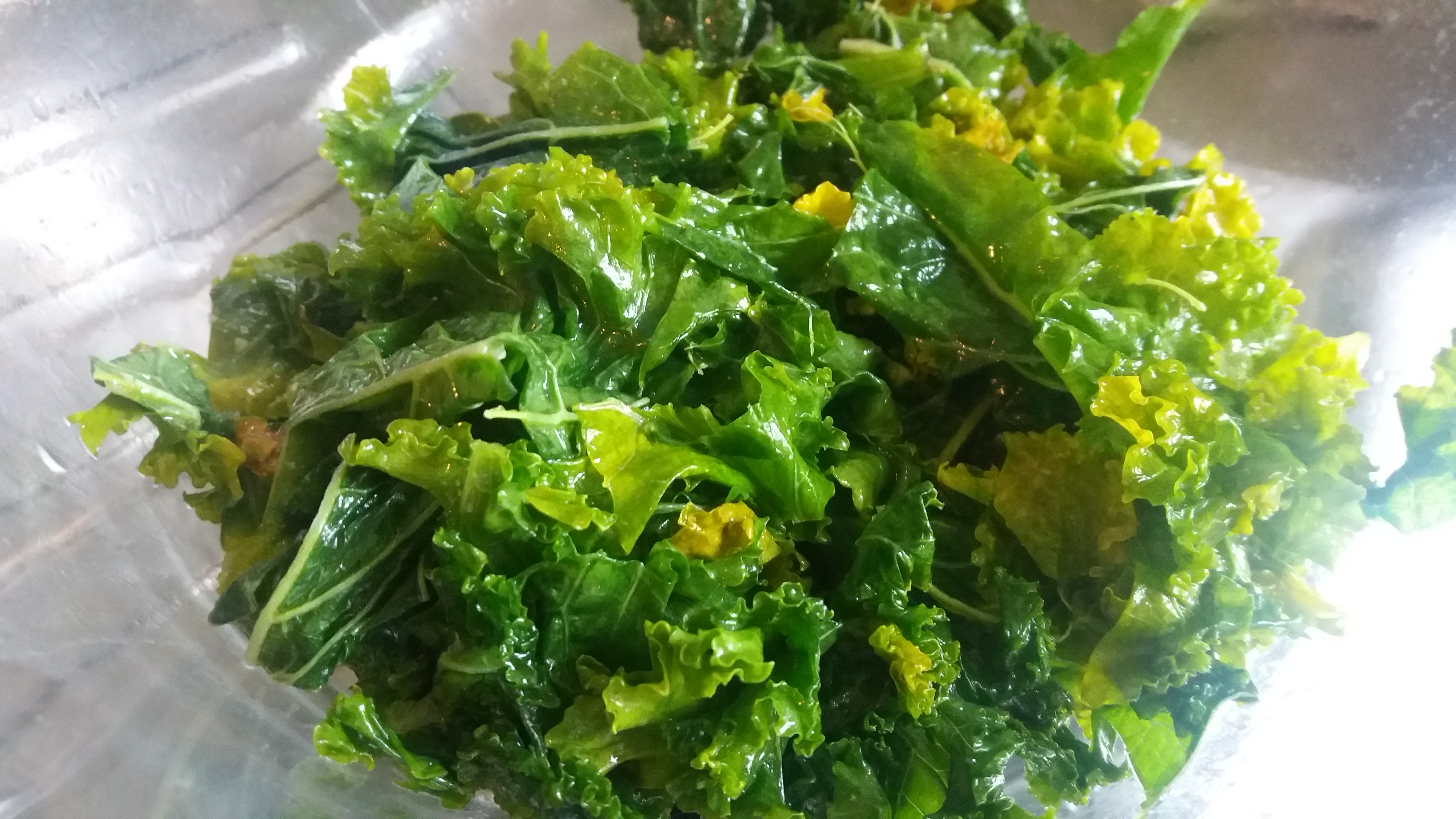 Empezamos a masajear la kale y enseguida veremos que pierde muchísimo volumen. Eso es lo que buscamos precisamente, así que cuando lo consigamos (unos 2 minutos), paramos.
