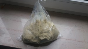 Debemos llegar a una consistencia pegajosa (engorrosa) pero elastica, de modo que deberemos amasar con las manos bien hasta obtenerla. Amasar significa mezclar una y otravez, hacer una bola, romperla, volverla a juntar, etc.