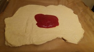 Estiramos primero con las manos un poquito y colocamos otro papel de horno por encima de la masa. Este truquito impide que la masa se nos pegue a las manos y al rodillo!!! Estiramos con ayuda de un rodillo o una botella hasta que quede muy fina, os ocupará casi la bandeja entera,