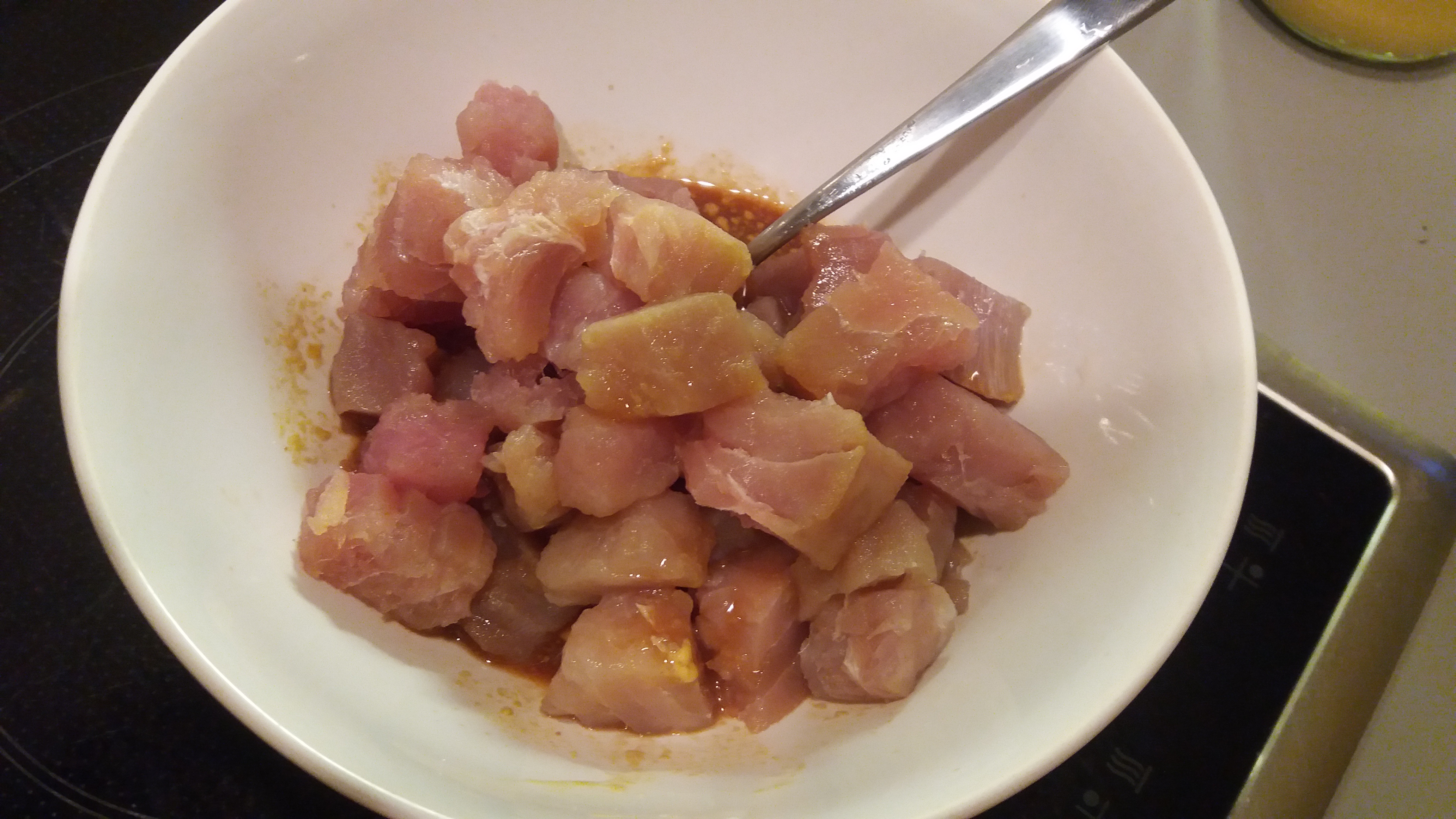Comenzamos cortando el pescado en daditos de un grosor aproximado de 1 ó 2 dedos. Os recomiendo cortarlo con un cuchillo muy afilado en lugar de tijeras.