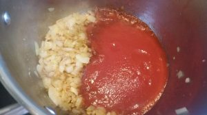 Pasados los 7 minutos que indicábamos para la cebolla, introducimos el tomate triturado y cuando empiece a hervir bajamos el fuego y tapamos (el tomate salpica y quema muchísimo!). Lo dejamos 5 minutos.