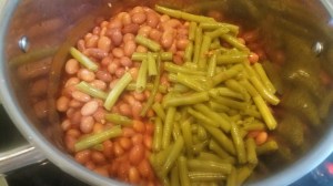 Agregamos a la cazuela del tomate 3 vasos de agua y, cuando comience a hervir a borbotones, introducimos las judías verdes y las alubias que ya estarán cocidas.