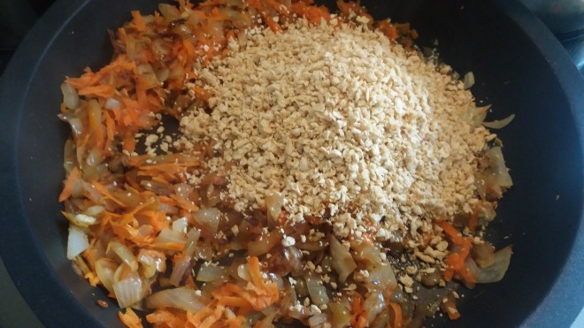 - Incorporamos la otra cucharada de aceite y cuando esté bien caliente agregamos la soja texturizada (tal cual), la sal, la pimienta y el orégano. Dejamos que se dore un poquito, unos 3 minutos removiendo de vez en cuando.