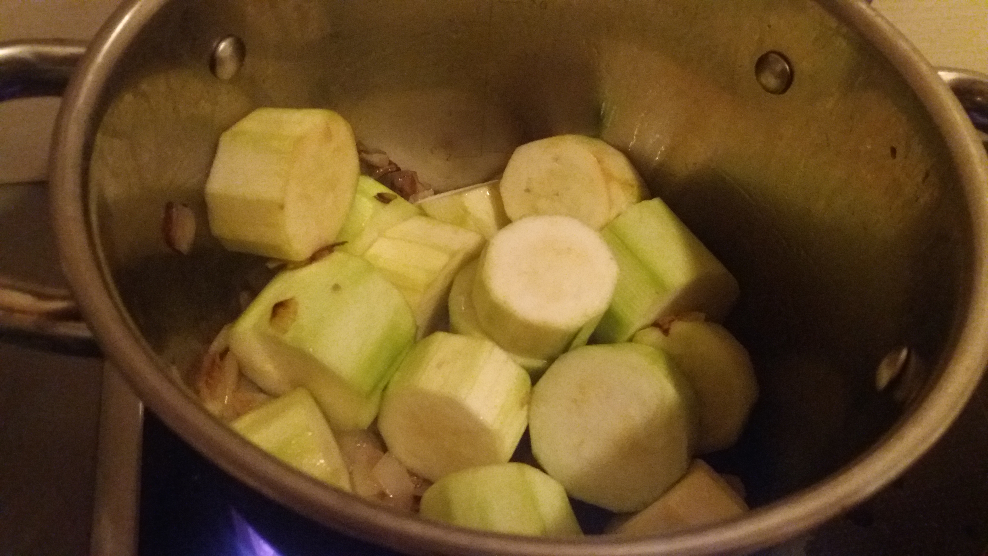 - Pelamos el calabacín (importante! si no quedará bechamel verde…), lo troceamos no muy grande (dados de 2 dedos) y lo incorporamos con la cebolla. Tapamos y dejamos que se cocine 8-10 minutos a ese mismo fuego medio.