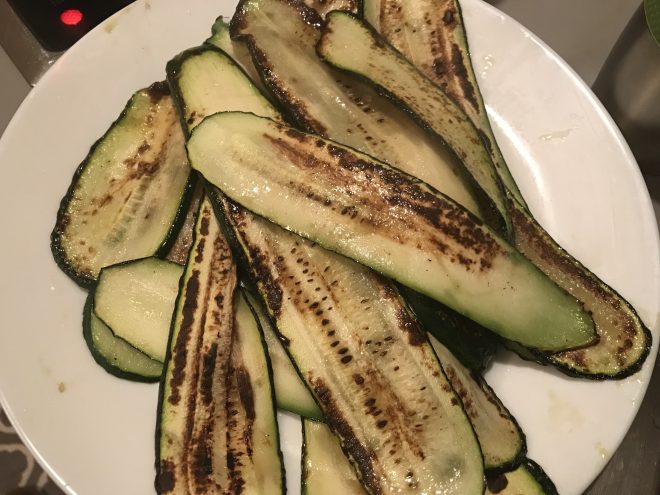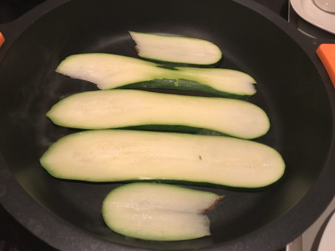 Calentamos nuestra sartén más grande a fuego fuerte, la engrasamos un pelín con aceite y un papel de cocina y vamos pasando las láminas de calabacín por ella para que se ablanden y doren ligeramente. Con una cara es suficiente (cuestión de segundos). OJO, no las pongáis todas amontonadas, por eso os decía que mejor la sartén grande.