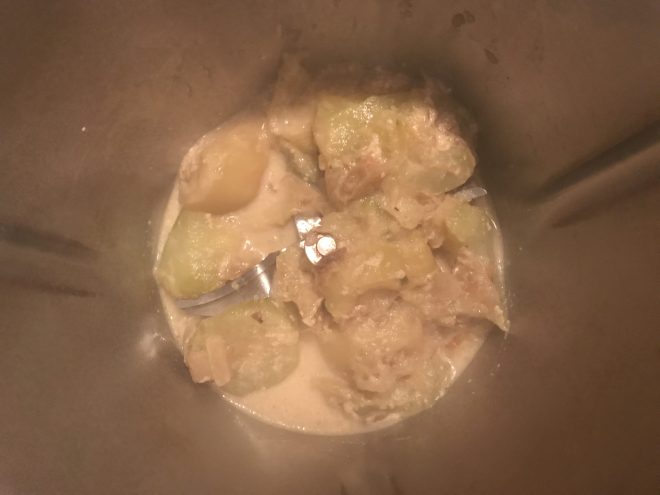- Añadimos la nuez moscada y trituramos SIN APENAS LÍQUIDO con la batidora hasta obtener una crema sin grumos.