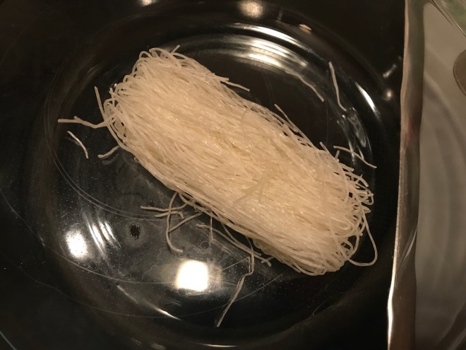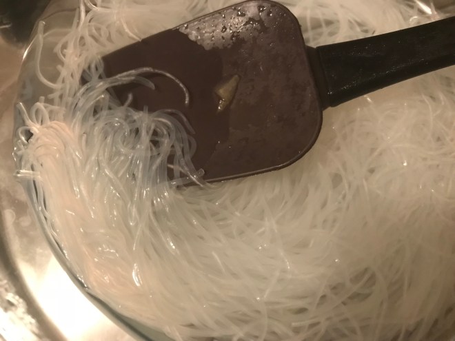 - Hervimos agua y la volcamos sobre los fideos de arroz durante 5min (si utilizamos fideos tradicionales podemos cocerlos en agua con sal normal en un cueco aparte). Lo de “volcarla” se debe a que estos fideos de arroz se cocinan de forma diferente, leed las instrucciones del envase en cualquier caso. Escurrimos y reservamos.