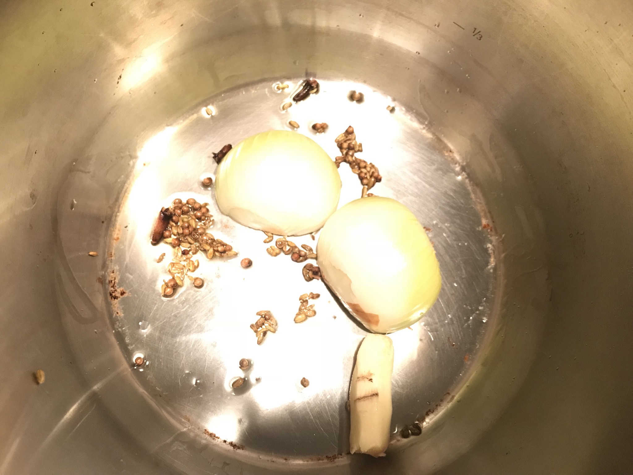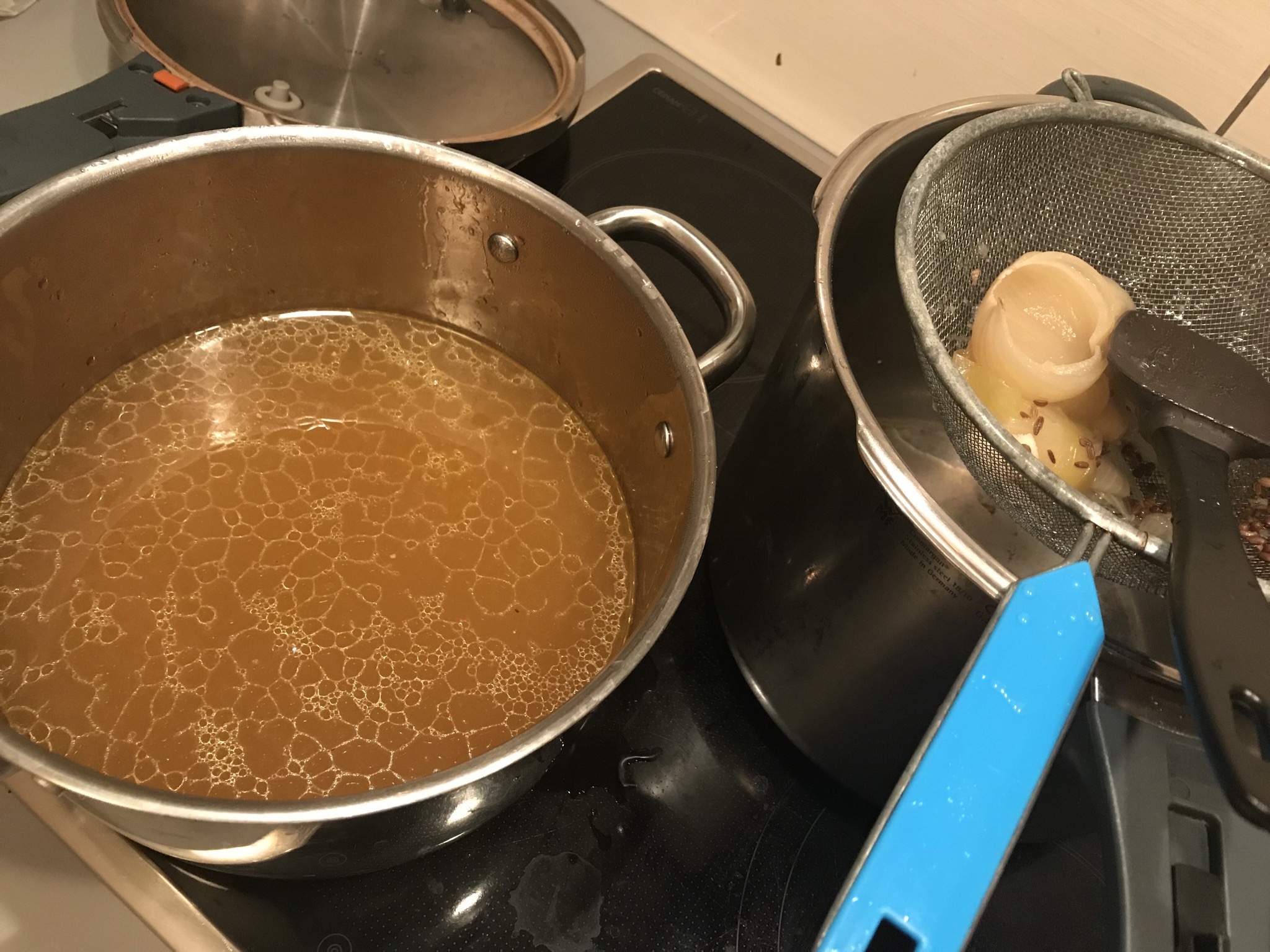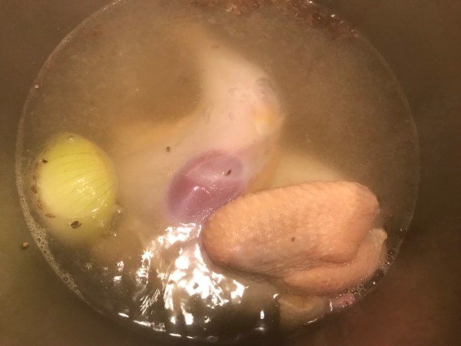 - la cebolla, el jengibre y la gallina que acabamos de preparar