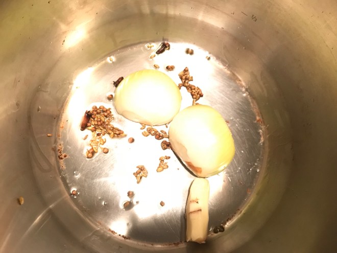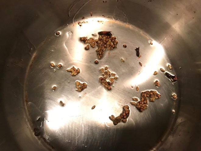 En la olla express ponemos un hilillo de aceite de oliva a calentar a fuego medio-fuerte. Ponemos las especias cuando esté muy caliente: