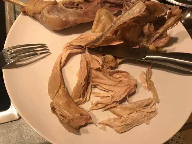 Una vez esté listo el caldo, lo colamos poniendo un colador grande sobre una cazuela. En este caso no hay que desgrasarlo porque veréis que apenas sale grasa. Descartamos todo lo que hay en el colador menos el pollo/gallina. Este pollo/gallina lo desmenuzamos con cuchillo y tenedor de forma que quede deshilachado, en hebras. Las reservamos.
