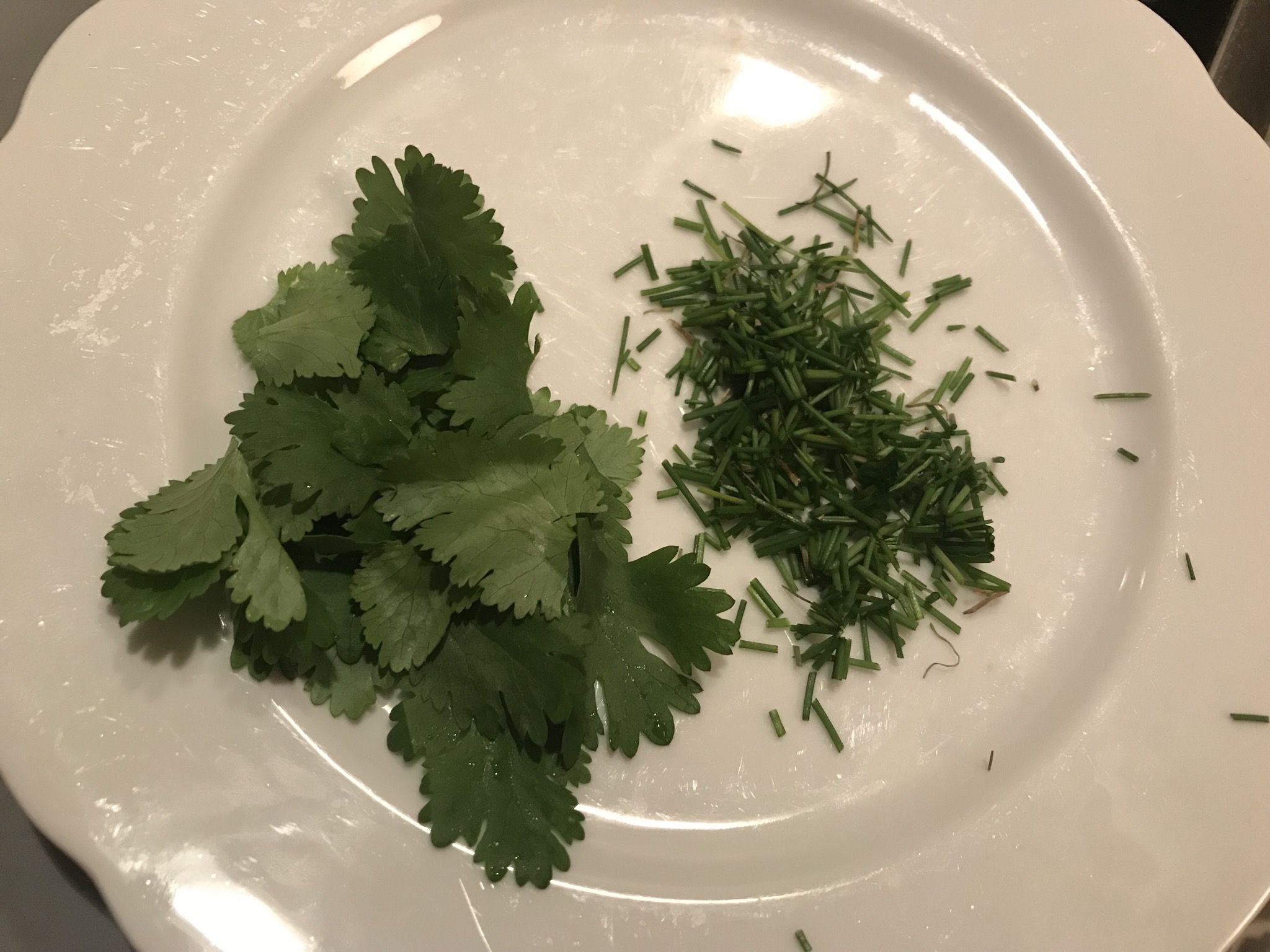 - Lavamos el cilantro y cebollino y los picamos con tijeras. Reservamos.