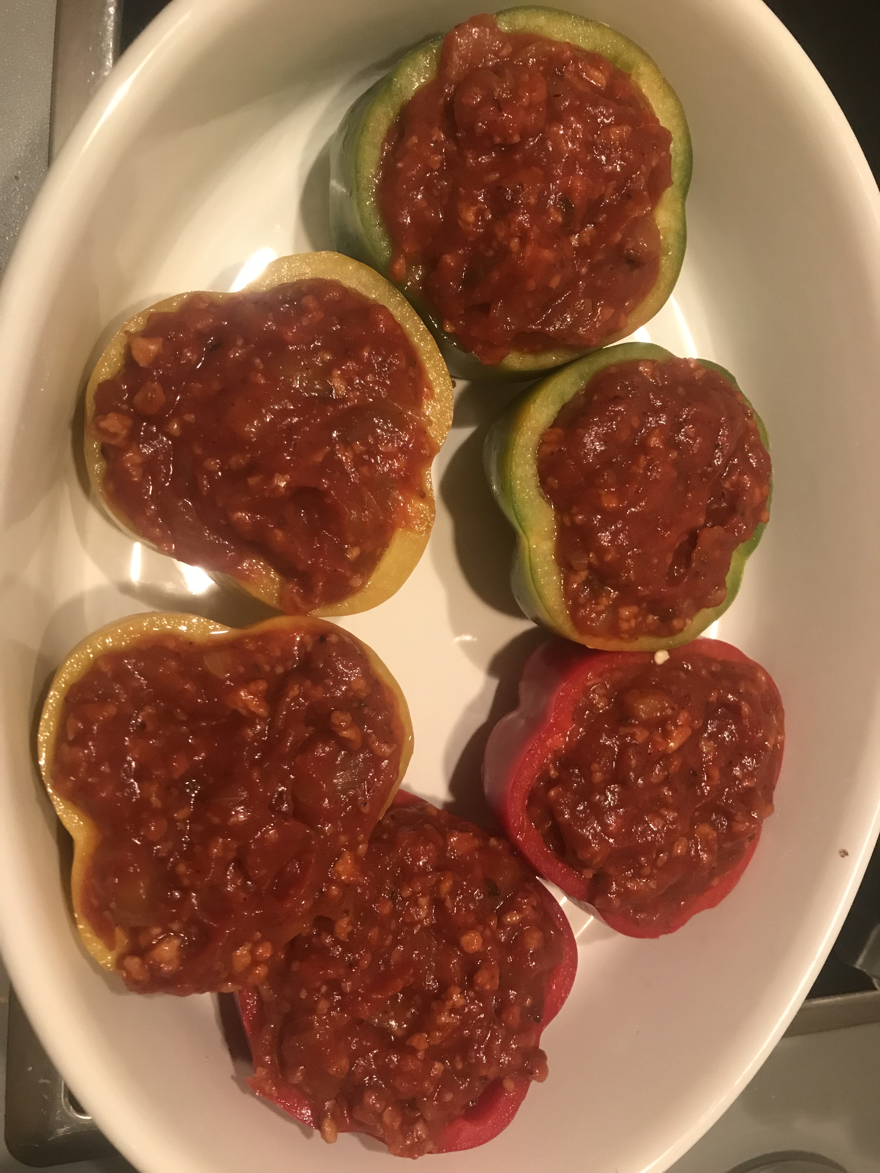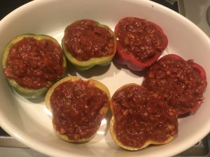 Una vez pasado el tiempo de la bolognesa, rellenamos los pimientos con la salsa procurando que queden bien prietos.