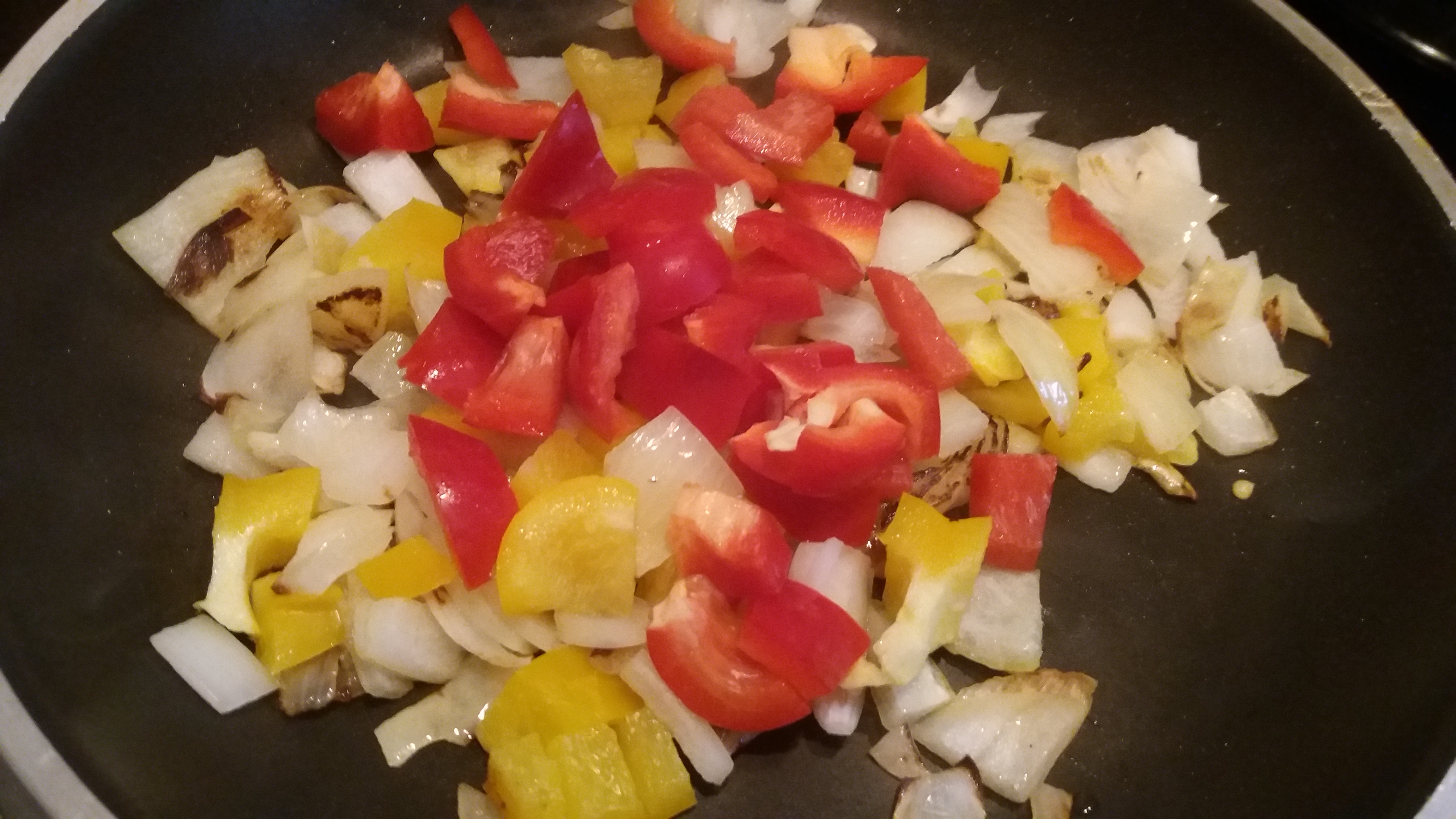 Picamos la cebolla y pimiento en trocitos pequeños. Ponemos a calentar en una cazuela/cocotte un chorro de aceite a fuego medio, y ponemos a pochar las verduras durante 5 minutos.