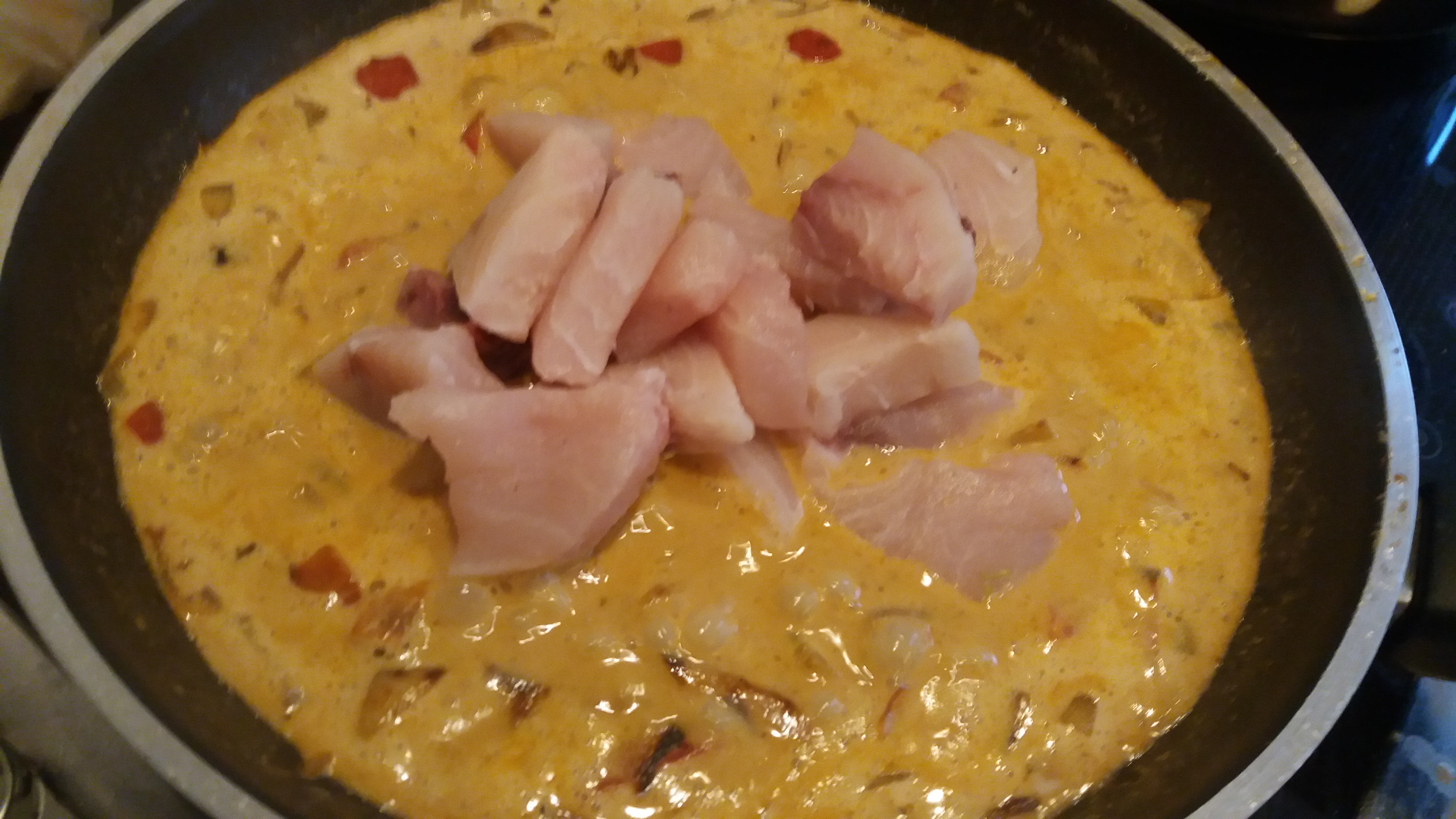 Incorporamos a la cazuela el pescado (podéis cortarlo en trocitos como yo o poner lomos enteros) y lo dejamos 5-10 minutos más con la tapa puesta (5 si son trocitos), dando alguna vuelta para asegurarnos de que se cocina por dentro.