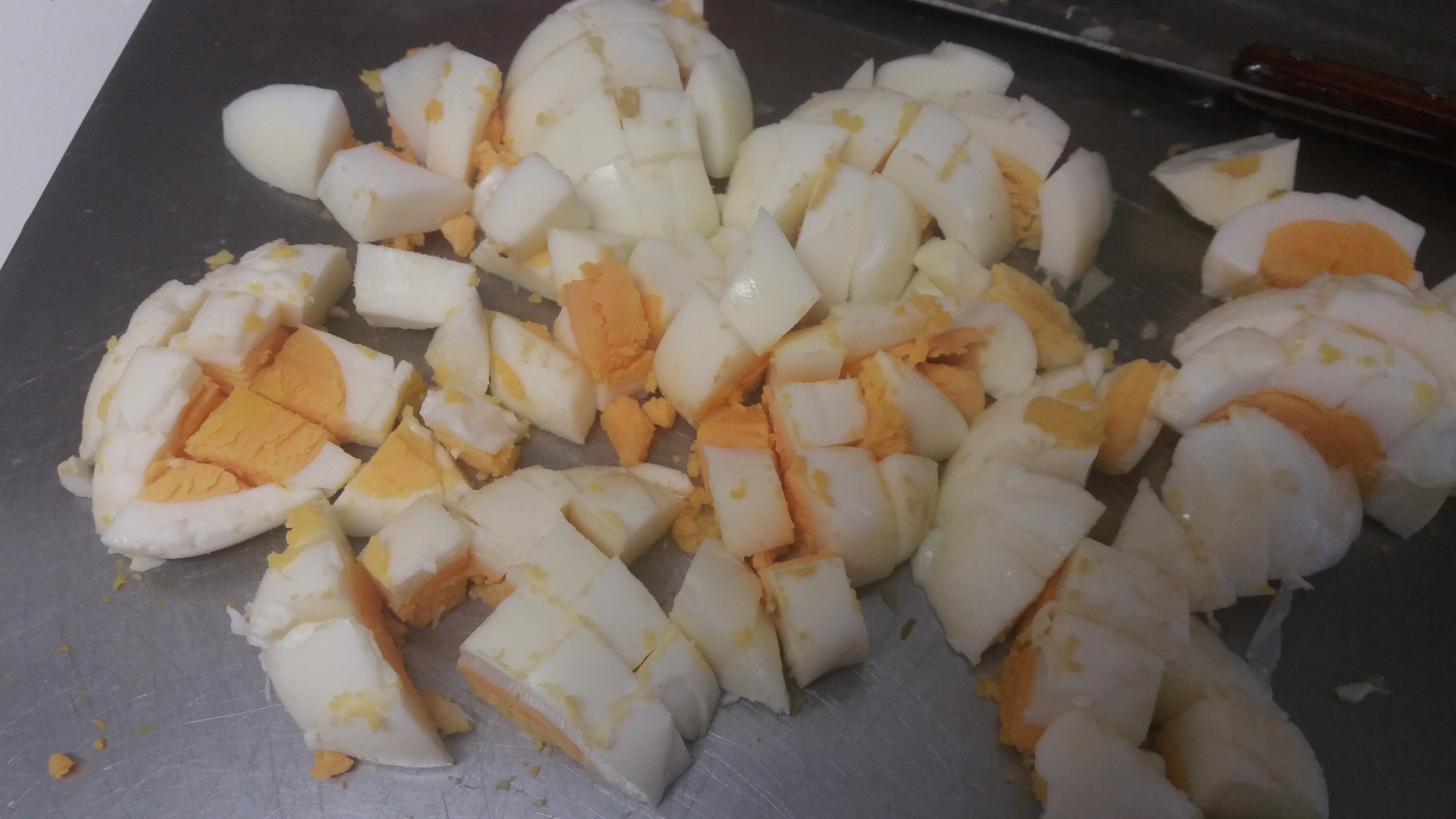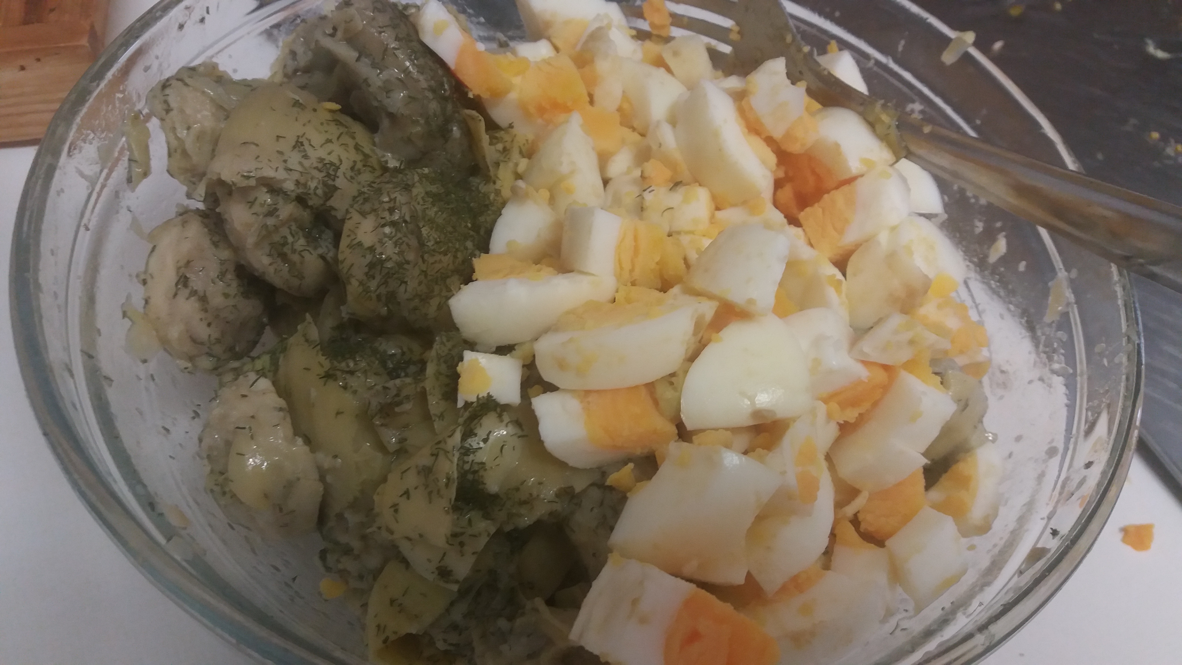 Escurrimos bien las alcachofas y las cortamos en trocitos similares a los espárragos. Pelamos los huevos y los picamos muuuy pequeñitos. En un cuenco, mezclamos las alcachofas troceadas con el eneldo y el huevo picado.