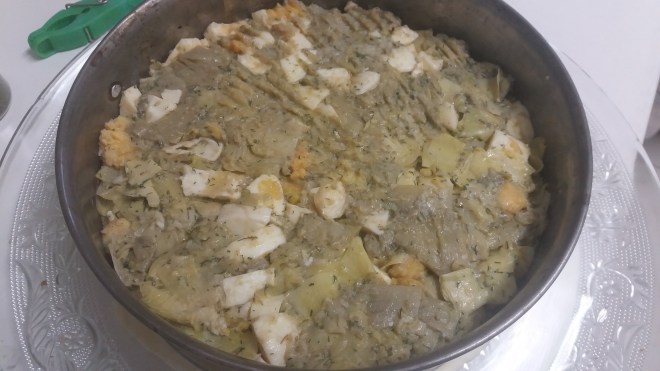 Encima, colocamos la mezcla de alcachofas y aplastamos también con un tenedor, con la intención de que quede compacto.
