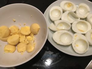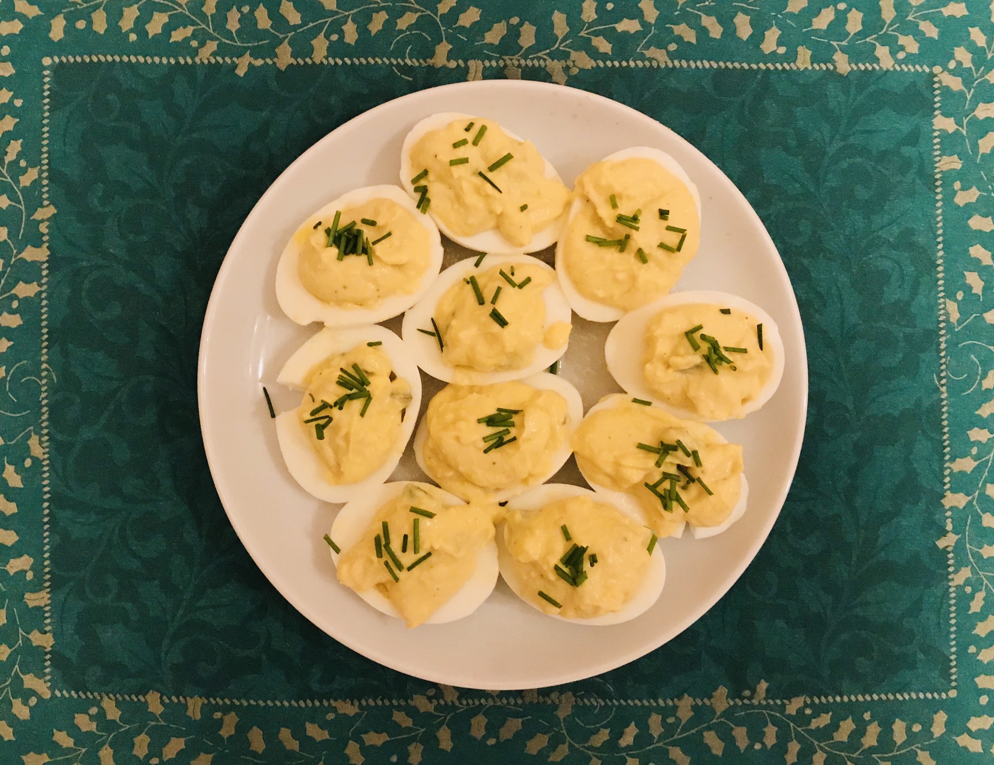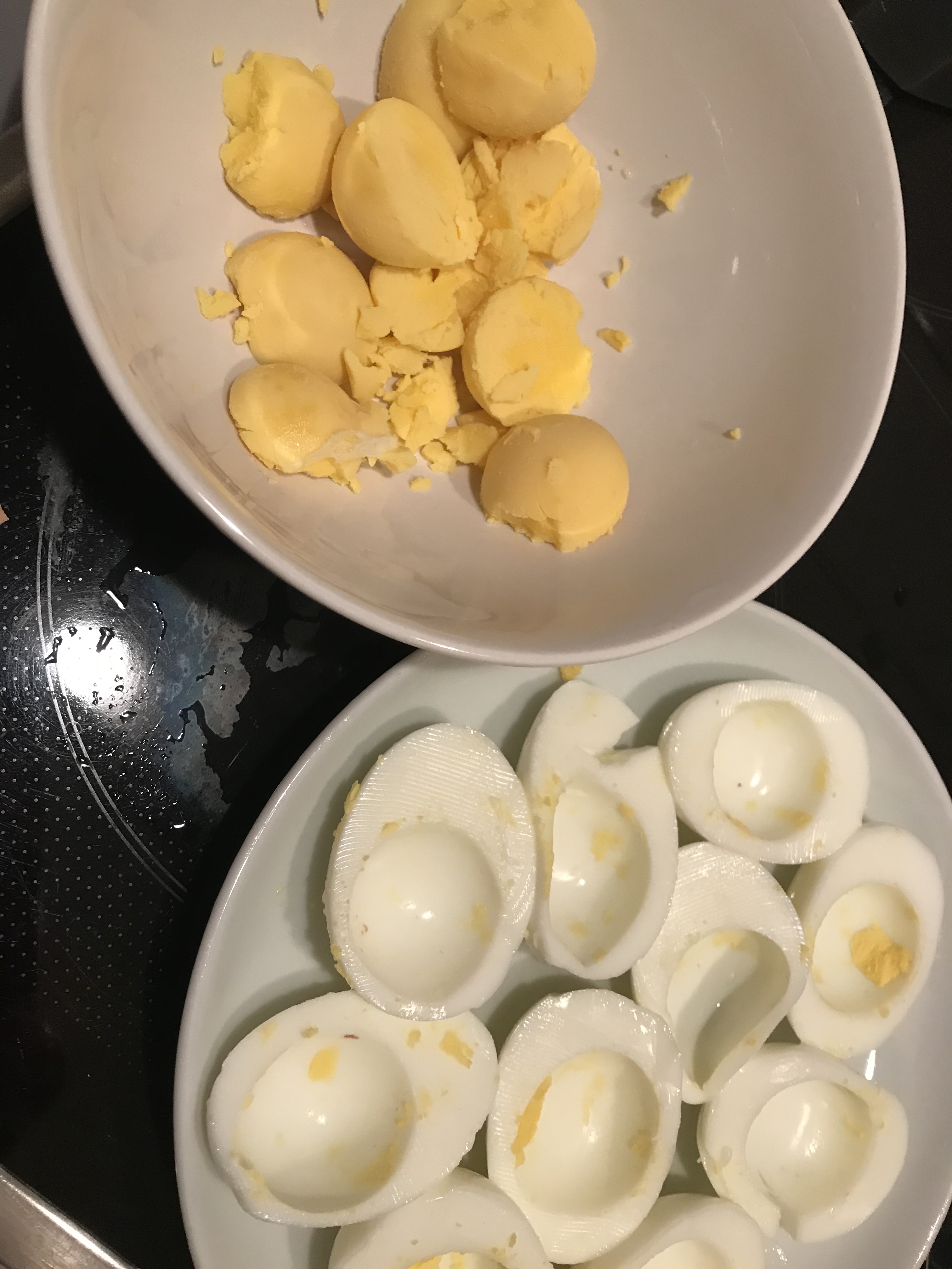 Existen mil recetas para preparar los deviled eggs, que reciben ese nombre pese a no ser insanos ni picantes. Básicamente son nuestros huevos rellenos pero con unos ingredientes específicos, pudiendo añadirles muchos otros a la receta “original” (tipo salmón, sucedáneo de caviar, encurtidos etc), que es la que hoy os presento y que me encantó!