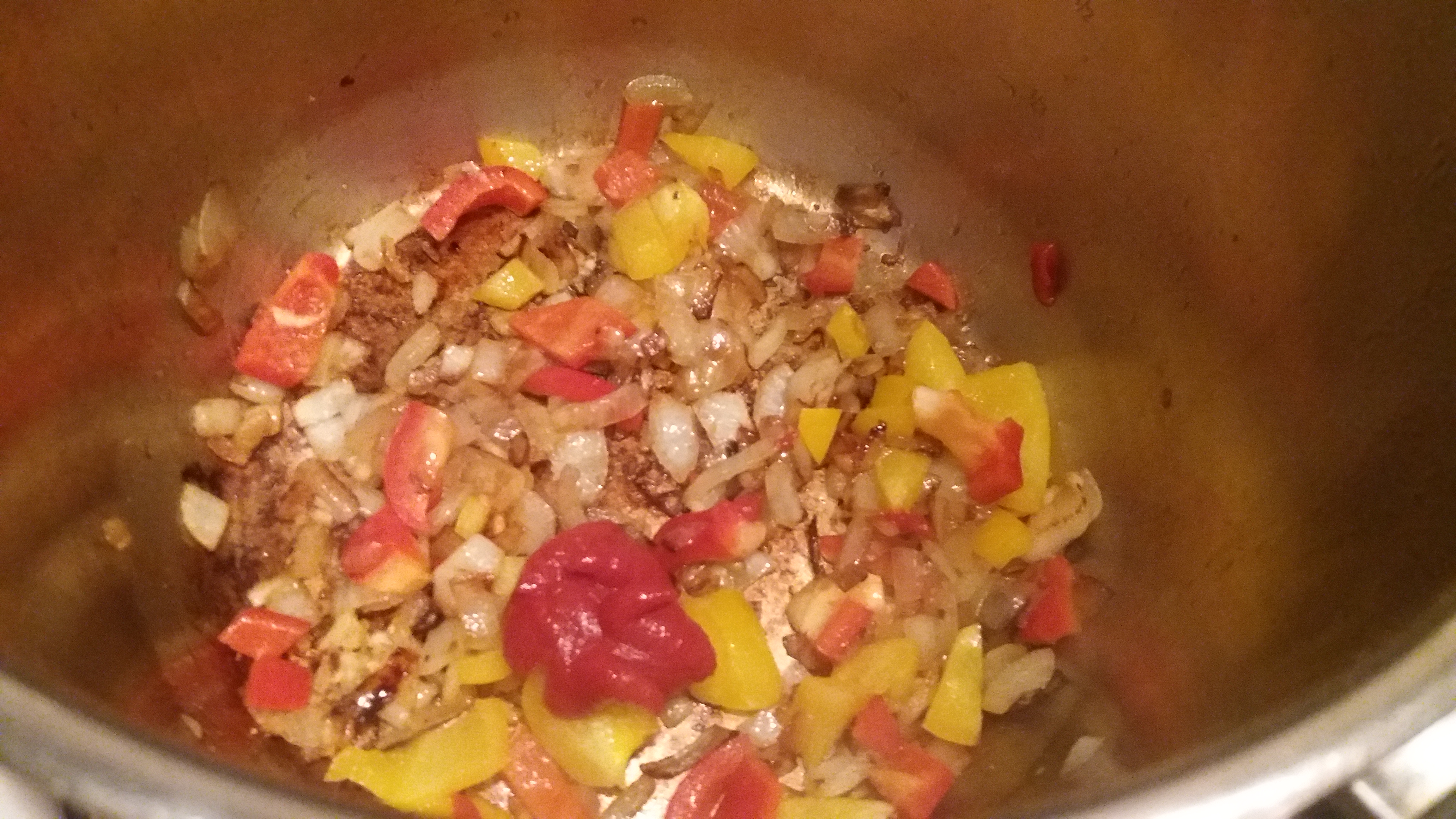 Cogemos una cazuela grande u olla express y ponemos un chorro de aceite de oliva a calentar a fuego medio. Picamos la cebolla, ajo y pimiento (no hace falta que sean muy pequeños) y los ponemos a pochar a fuego medio 5 minutos.