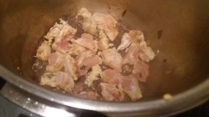 Sin necesidad de limpiar la cazuela anterior, ponemos otro chorrito de aceite a calentar a fuego fuerte y doramos el pollo. Yo lo he troceado porque eran pechuguitas, pero si son jamoncitos dejadlos tal cual. Ojo, no queremos que se cocine por dentro, únicamente queremos que se dore por fuera.