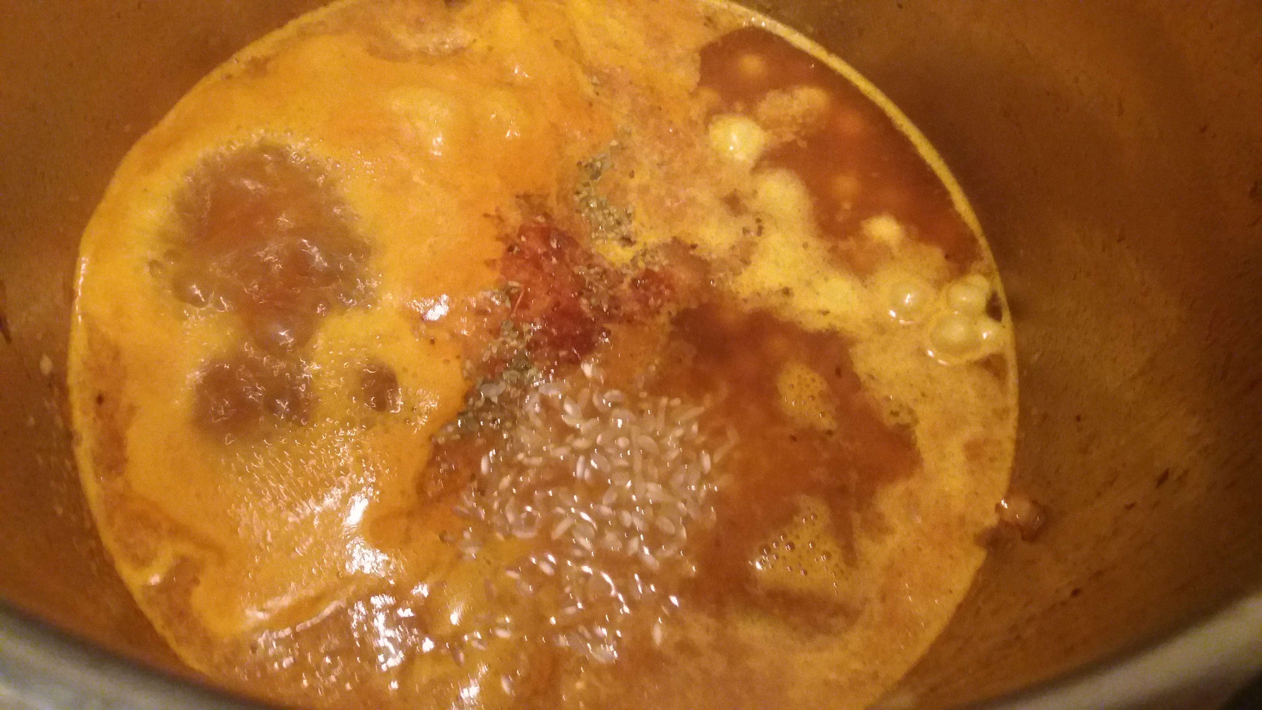 Volvemos a incorporar a la cazuela del pollo lo que habíamos triturado antes, los garbanzos (si eran de bote, recordad enjuagarlos bien antes en un colador con agua del grifo hasta que deje de salir espuma), el arroz, las especias y 1 cucharadita más de sal. Este guiso es caldoso, por lo que si lo veis con poco líquido añadid un vaso de agua o dos.