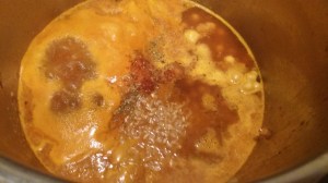 Sacamos el contenido de la cazuela y lo trituramos junto con el tomate frito, la pastilla de caldo/sal y 2 vasos de agua. Lo reservamos un momento.