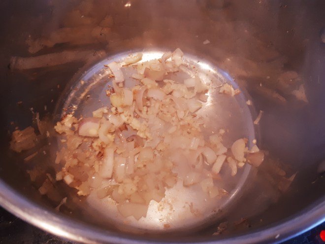 Picamos la cebolla en cuadraditos pequeños y prensamos o picamos el otro diente de ajo. En una cazuela baja o sartén amplia, ponemos a fuego medio-suave aceite y pochamos el ajo y la cebolla durante 5 minutos.