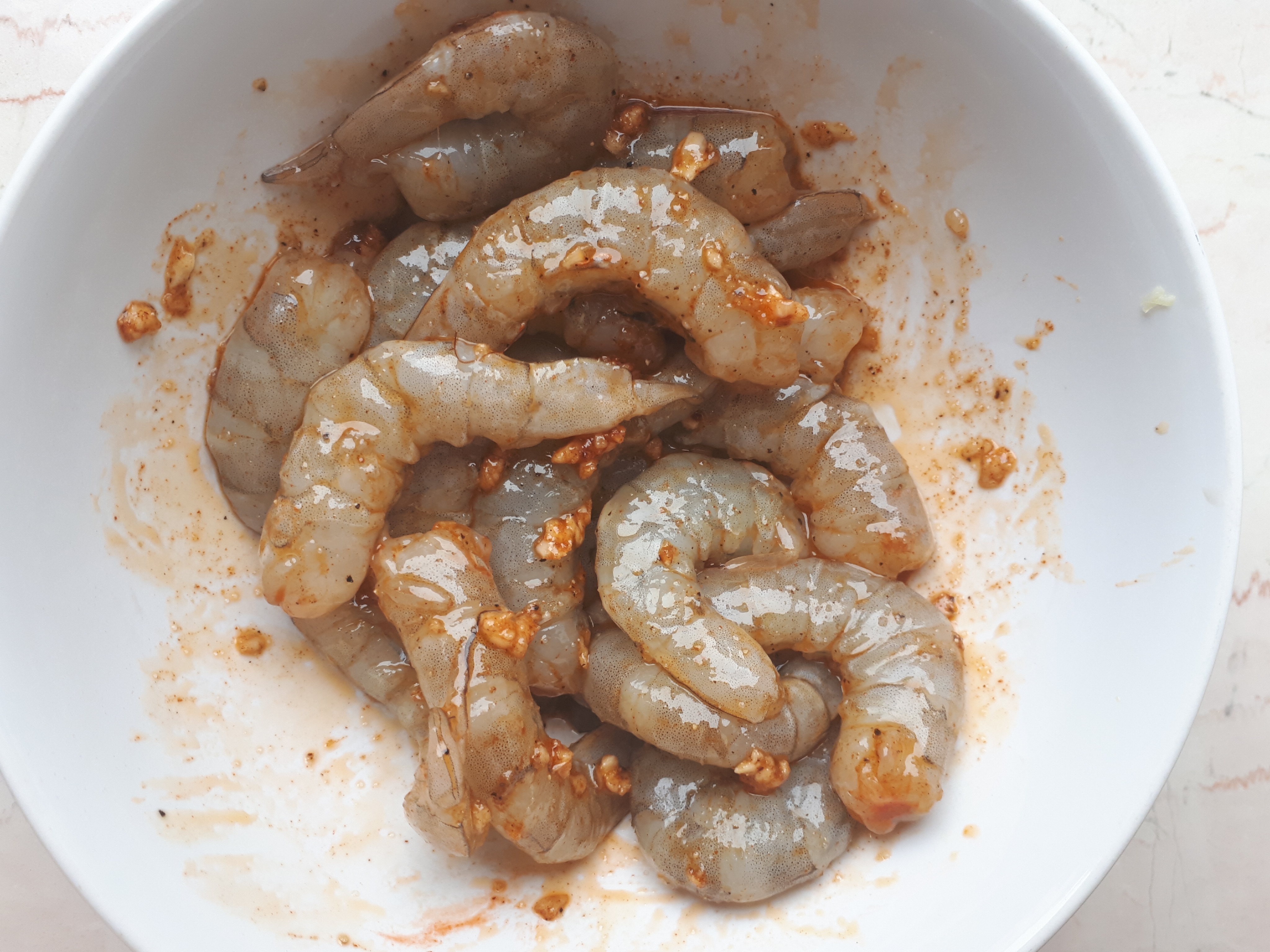 Antes de cocinar las gambas, vamos a adobarlas en un adobo muy parecido al de las clásicas cintas de lomo: con un diente de ajo aplastado, el pimentón, dos cucharadas de aceite de oliva, sal y pimienta negra. Las pelamos si venían con piel y las dejamos en esta mezcla mientras preparamos lo demás.