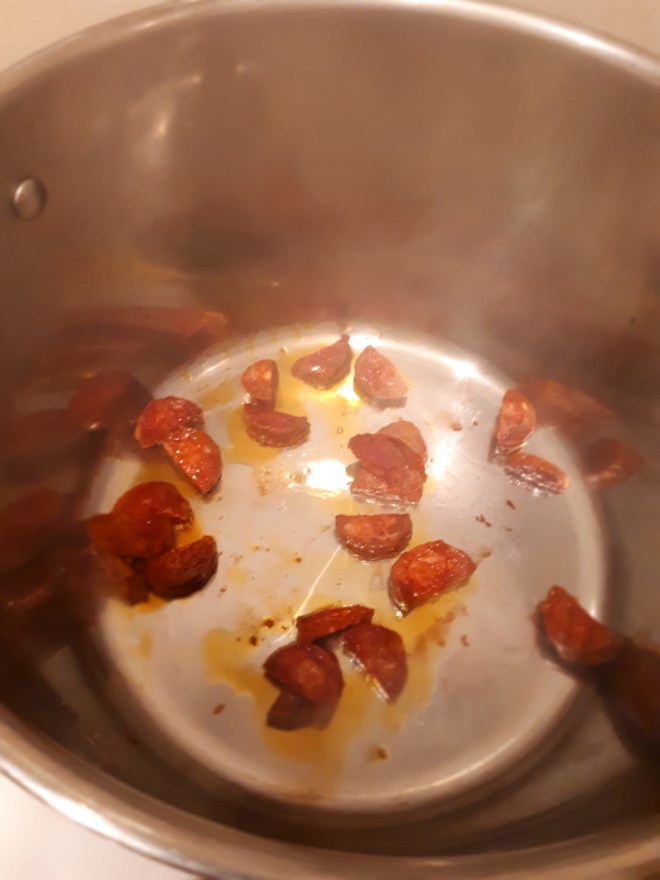 Cogemos una cazuela grandecita a calentar a fuego fuerte y ponemos en ella el chorizo previamente troceado en rodajitas y éstas en semicírculos (no hace falta aceite de momento). La idea es que el chorizo suelte su aceitillo y sabor, y se lo pase luego a las verduritas.