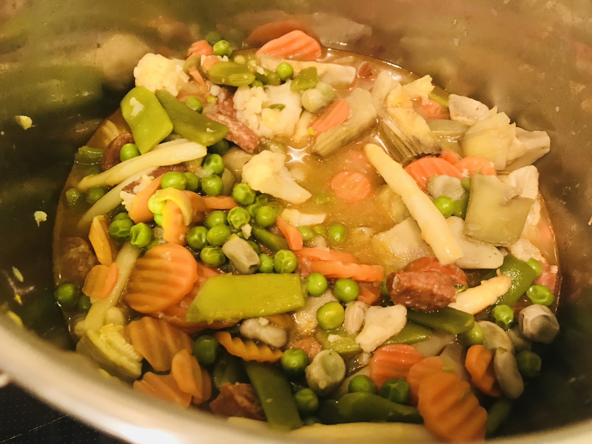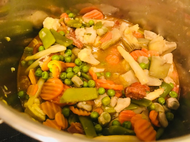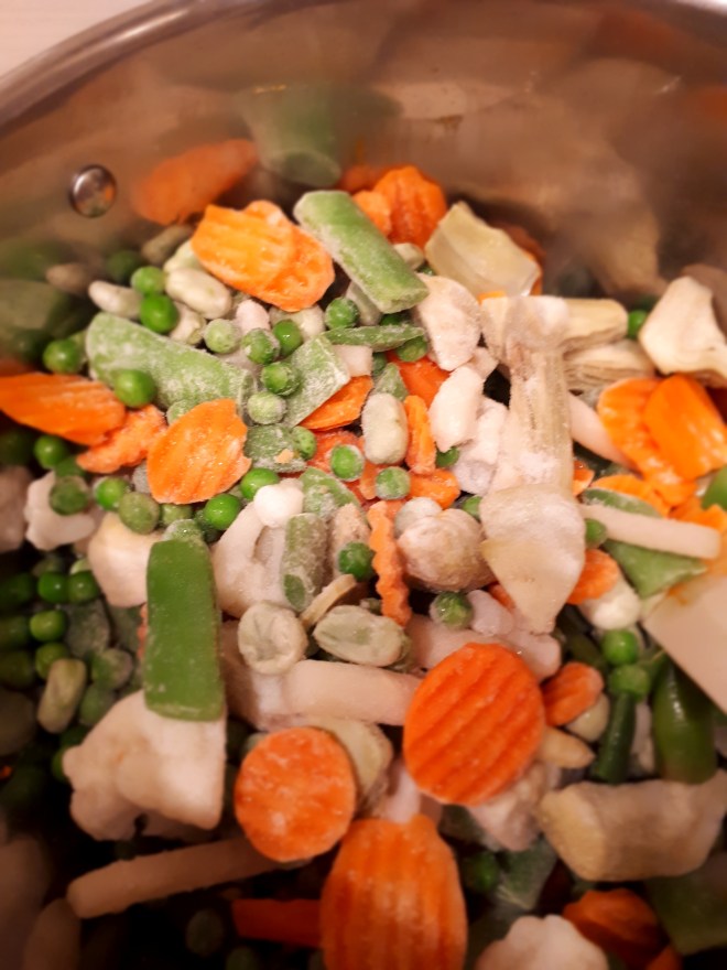 - 1 bolsa de 1 kg de menestra congelada (o bien una mezcla de guisantes congelados, un puñadito de judías verdes, zanahorias en rodajas, coliflor en ramilletes pequeños, alcachofa cruda troceada, espárragos troceados…)