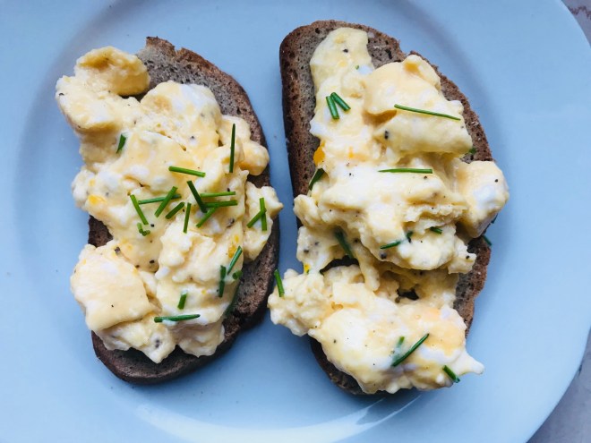 Tostamos nuestro pan y colocamos los huevos por encima, espolvoreando un poco de cebollino si lo deseamos.