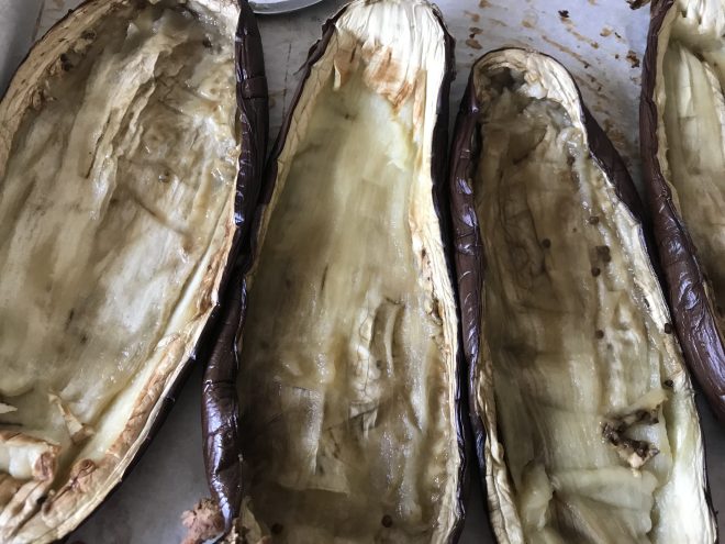 Para ello, precalentamos el horno a 180-200º con calor arriba y abajo. En una fuente apta para horno ponemos las berenjenas cortadas por la mitad, con la parte plana hacia arriba y con unos cortes en esa parte plana. Dejamos que se asen unos 45 min-1 hora, hasta que estén muy tiernas.