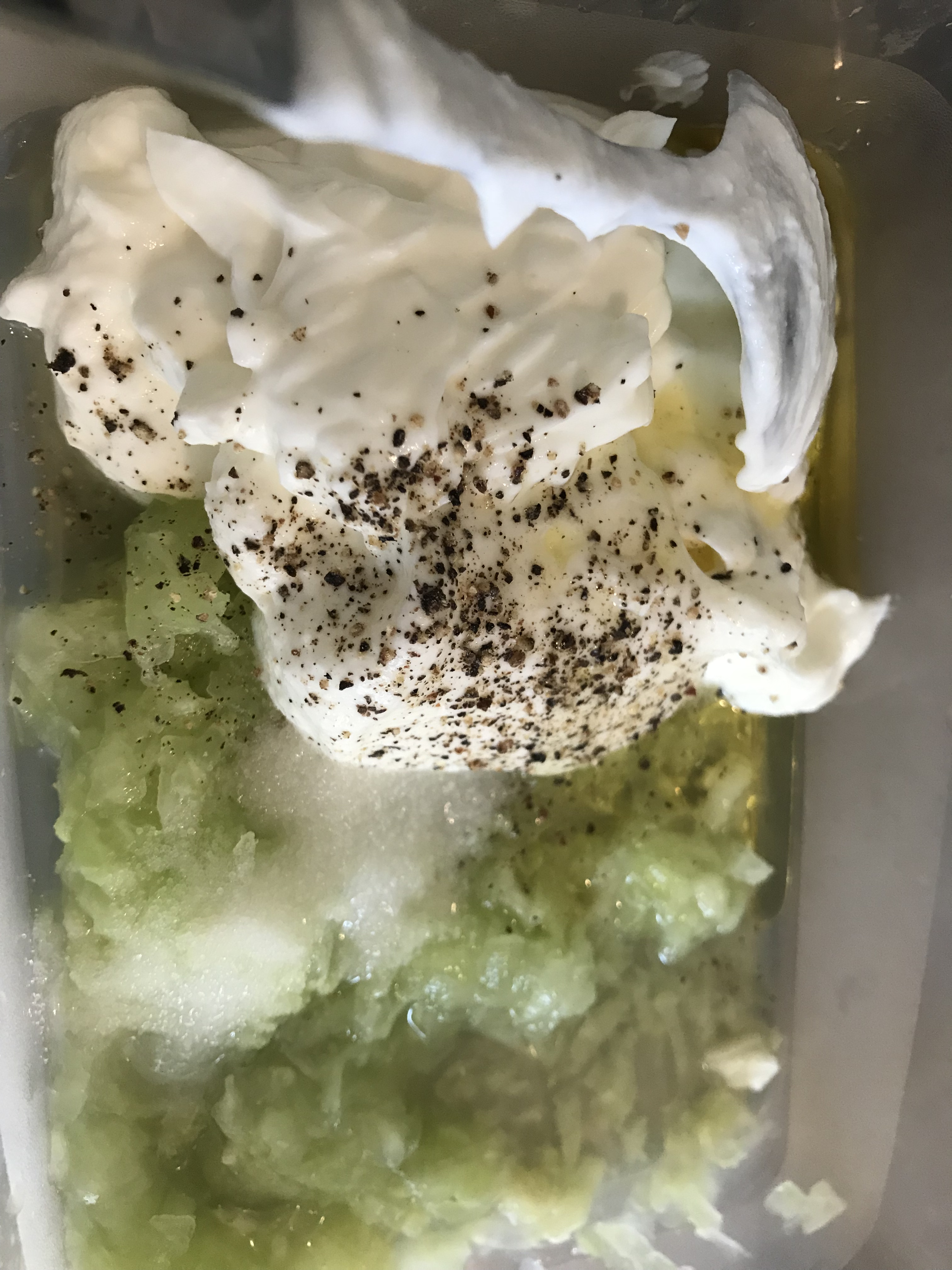 Mezclamos en un cuenco grande el pepino con el ajo, el yogur, el zumo de limón, la sal, pimienta y aceite.