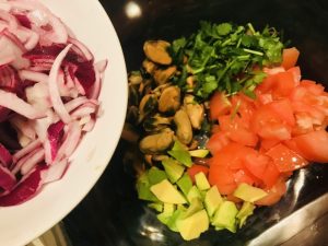 Añadimos tomate+aguacate+mejillones al bol donde estaba la cebolla y demás, pero solo cuando vayamos a consumir el plato.