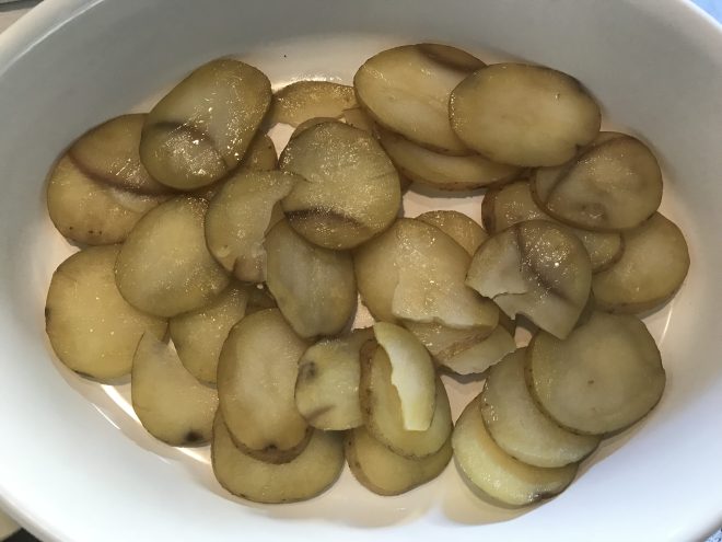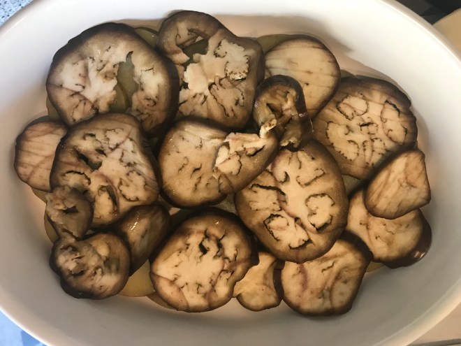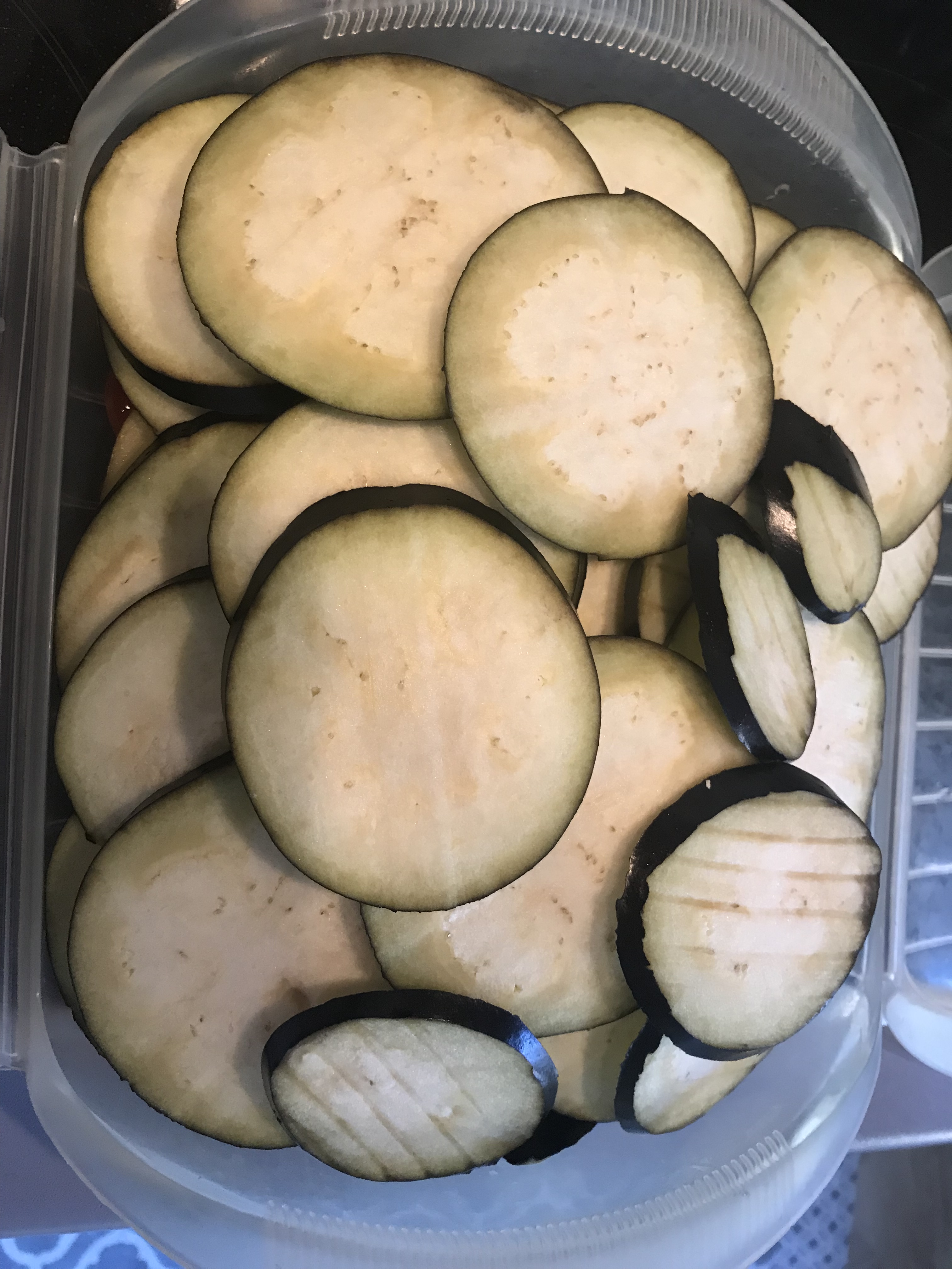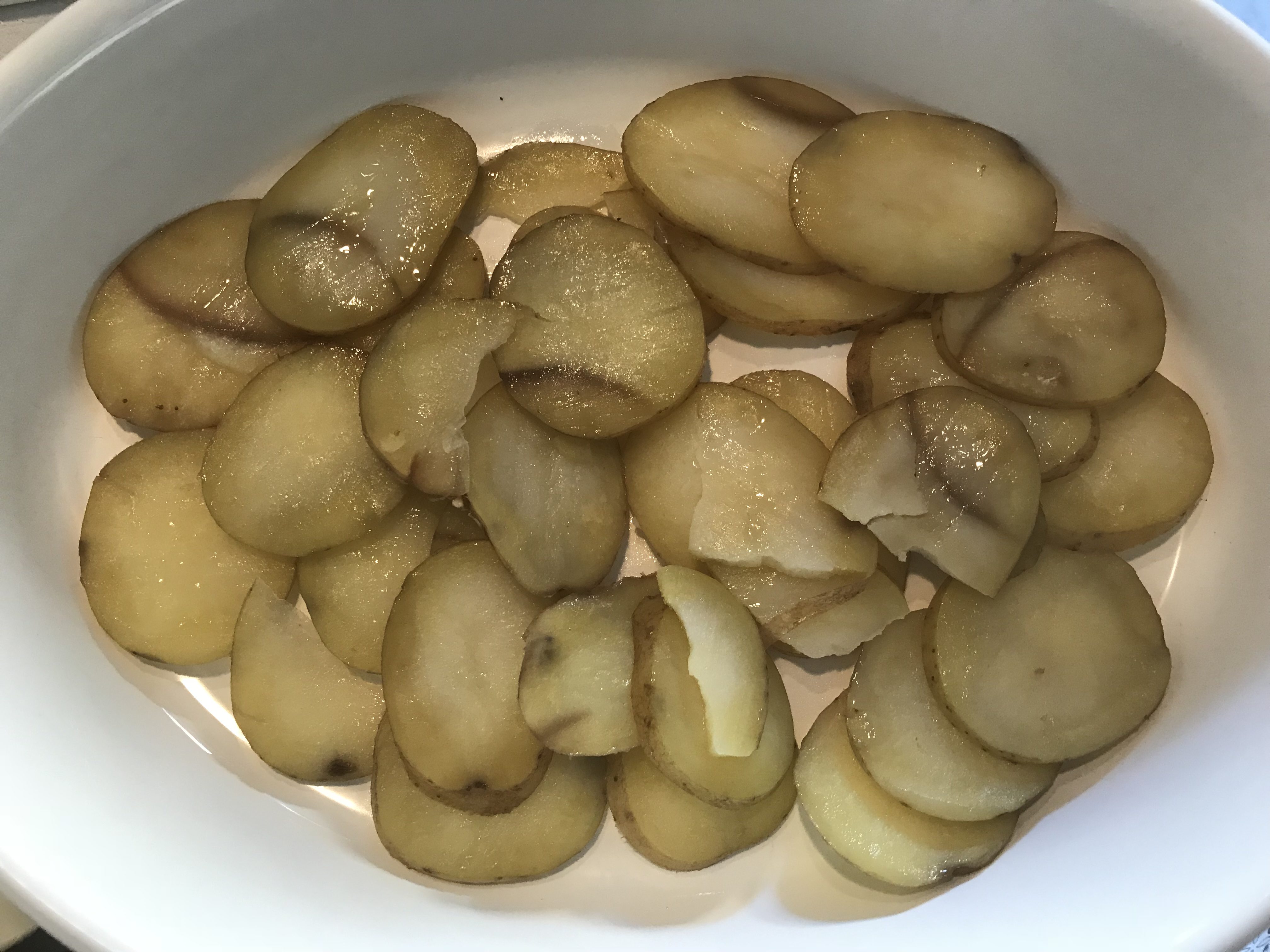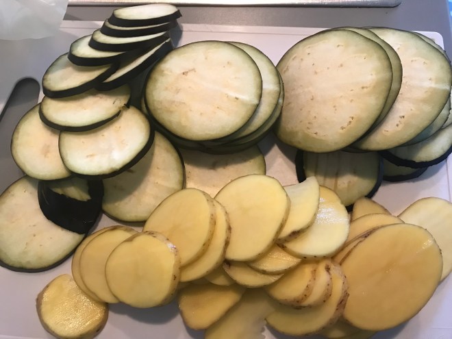 Para hacer las placas de berenjena y patata, las lavamos y cortamos en rodajas de menos de 1 dedo de grosor. Las cocinamos al vapor en el microondas con ayuda de un estuche de vapor o bien en una fuente apta para micro, que taparemos bien con papel film. En 10 minutos deberían estar blanditas, pero si no dejadlas otros 3 minutos.