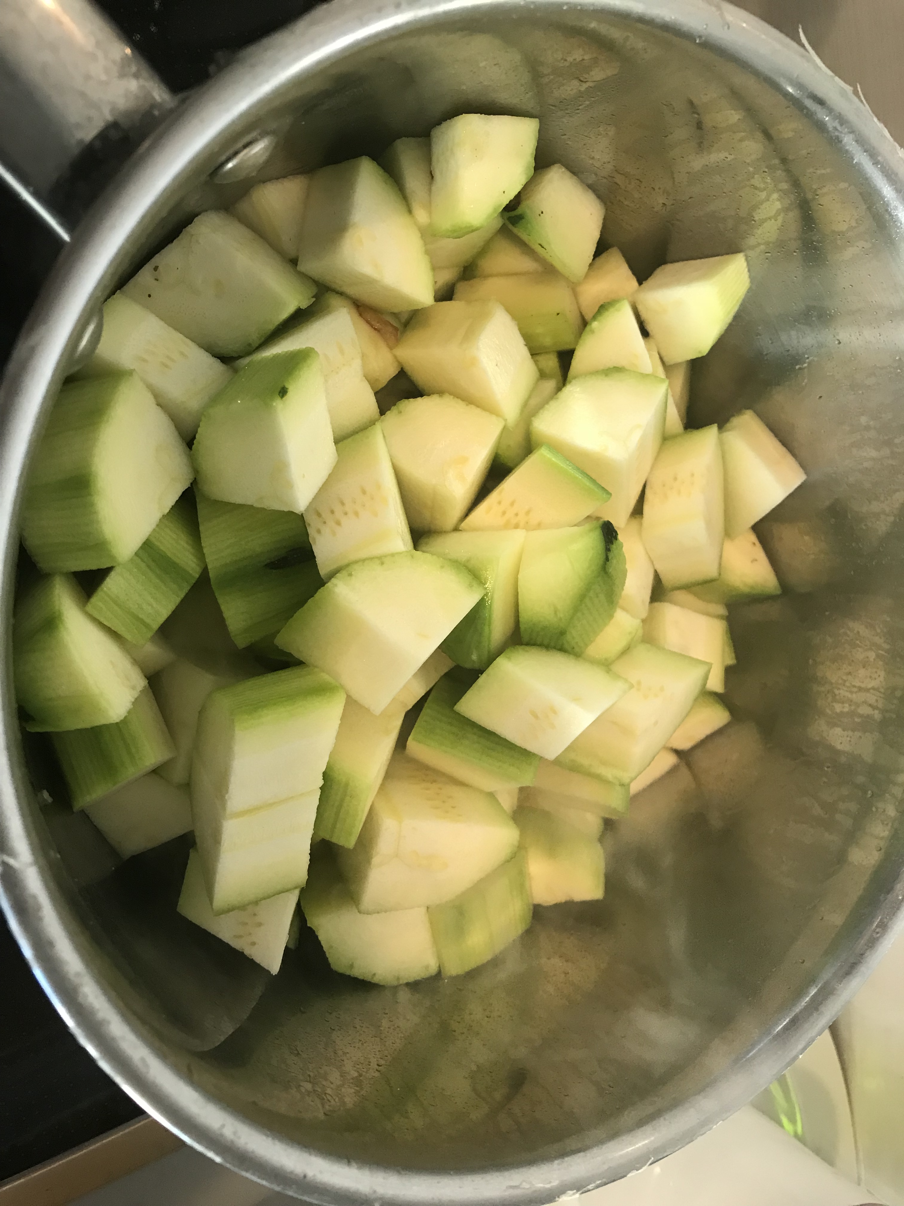 Pelamos el calabacín, lo troceamos pequeño y lo incorporamos a la cazuela.