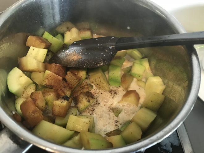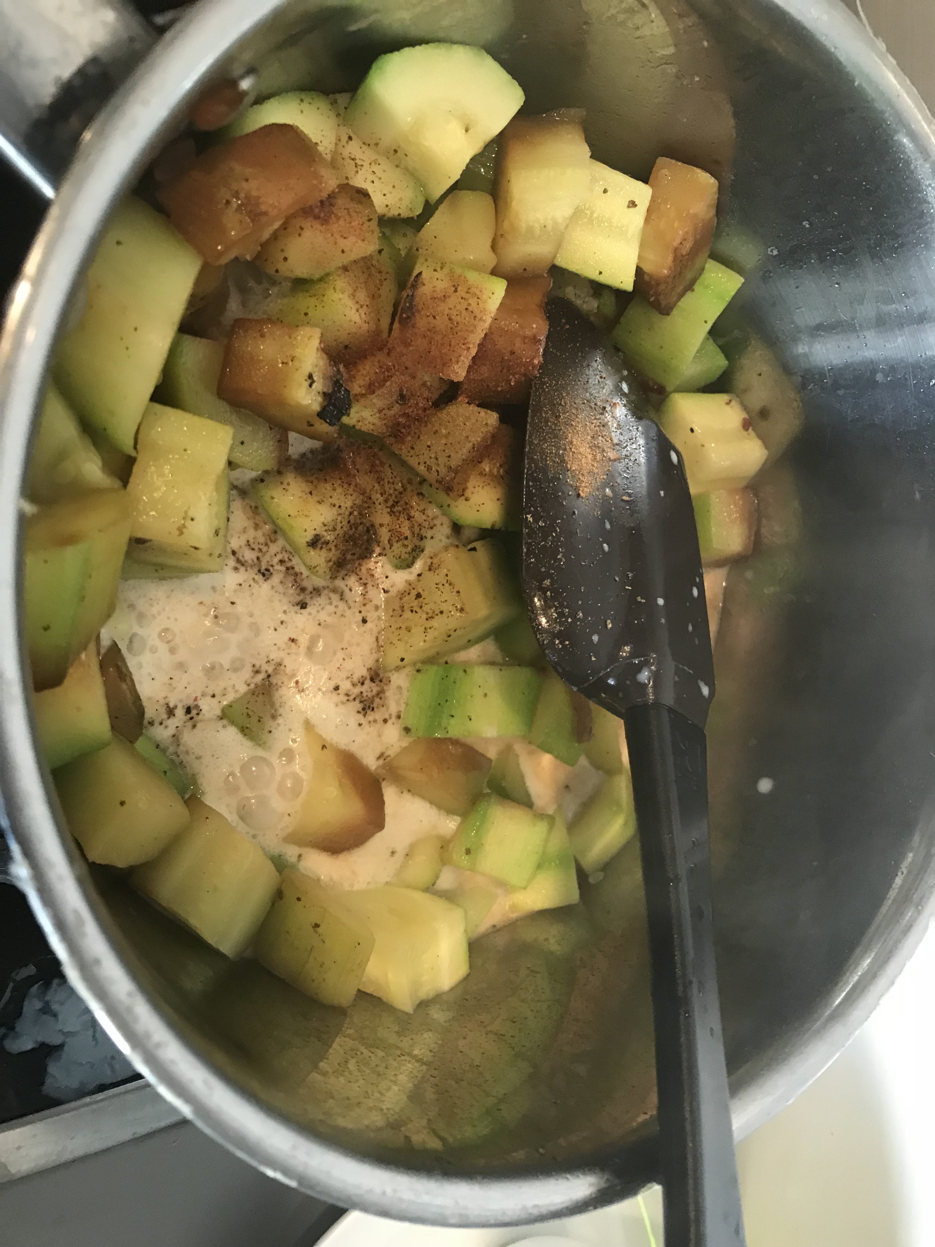 Pasados 7 minutos agregamos los demas ingredientes, tapamos y dejamos cocinar hasta que el calabacín esté tierno.