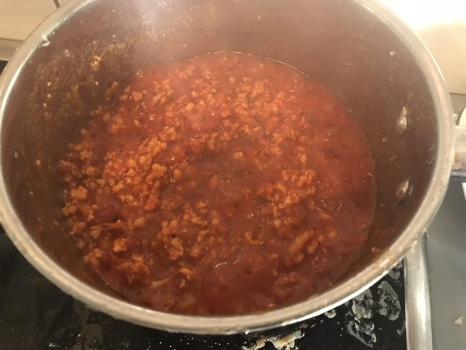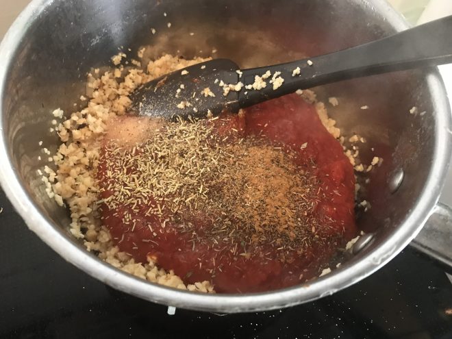 Picamos o prensamos el ajo y lo ponemos a rehogar en un cacito con un hilo de aceite 2 minutos a fuego medio. Si vamos a usar carne, la incorporamos ahora para que se dore. Si vamos a usar soja, no es necesario. Incorporamos el resto de ingredientes indicados de la salsa (soja incluida, en su caso), bajamos a fuego bajo y dejamos cocinar 10 minutos tapado.