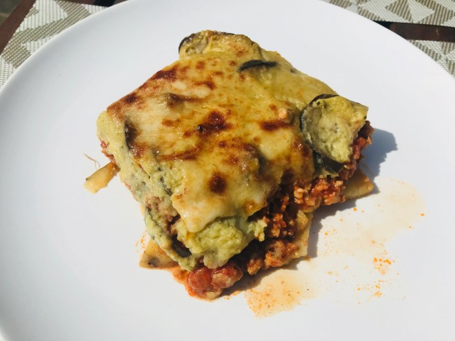 Hoy os voy a presentar MI versión de este plato tan delicioso. Y resalto que es MI versión porque la he aligerado bastante. Cómo? sustituyendo la bechamel clásica por la de calabacín, la carne de cordero por soja texturizada (eso lo dejo a vuestra elección) y cocinando al vapor berenjena y patata en lugar de freírlas.