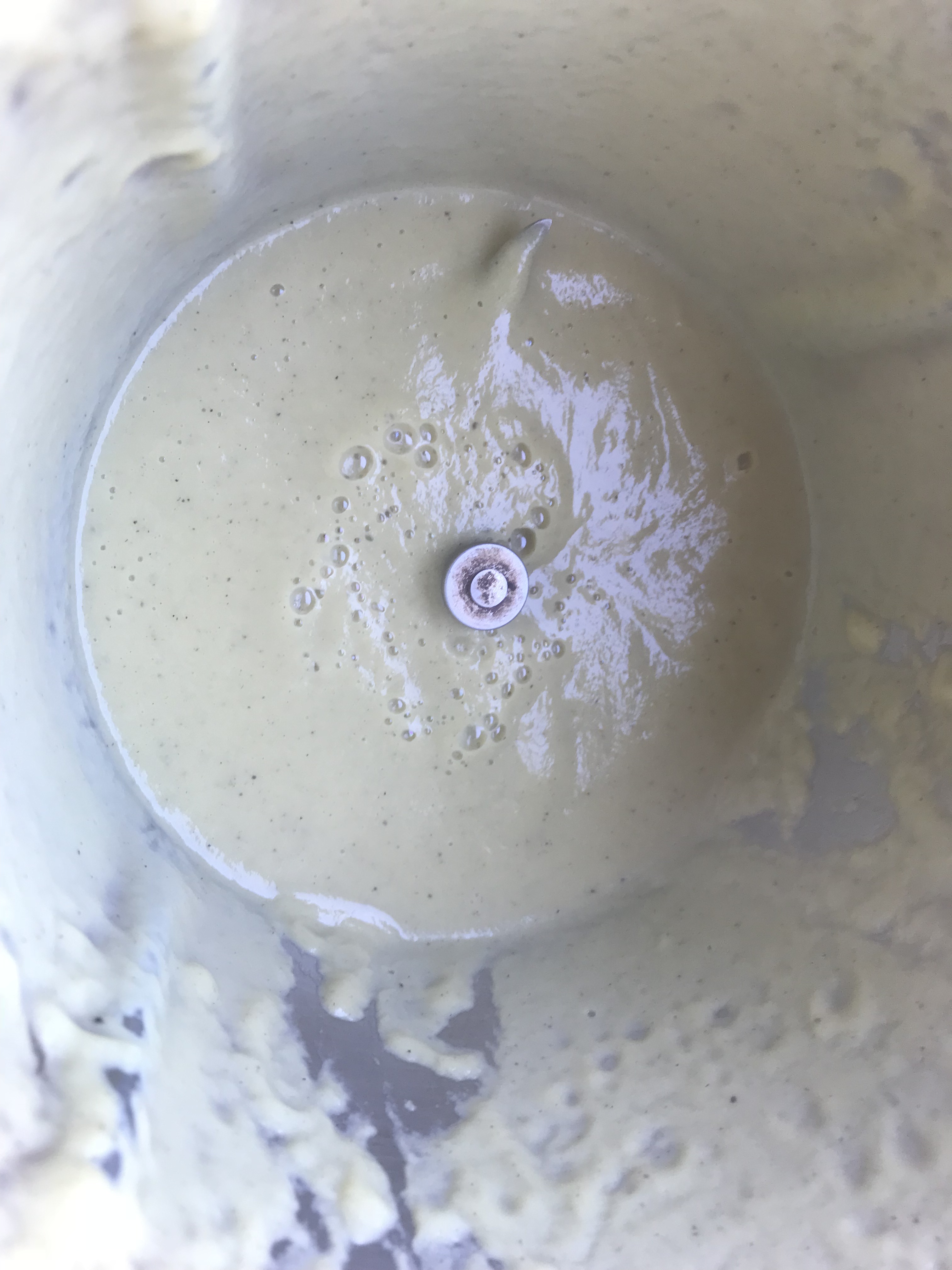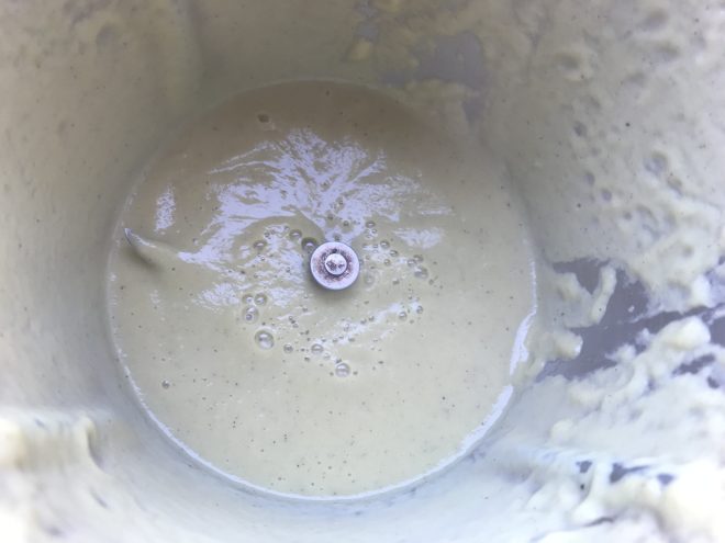 Trituramos con la batidora sin echar nada del líquido. Si lo vemos demasiado espeso, vamos agregando líquido hasta que obtengamos una textura de bechamel.