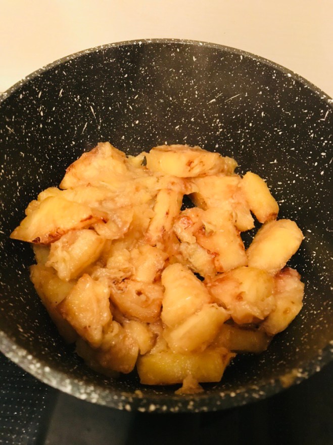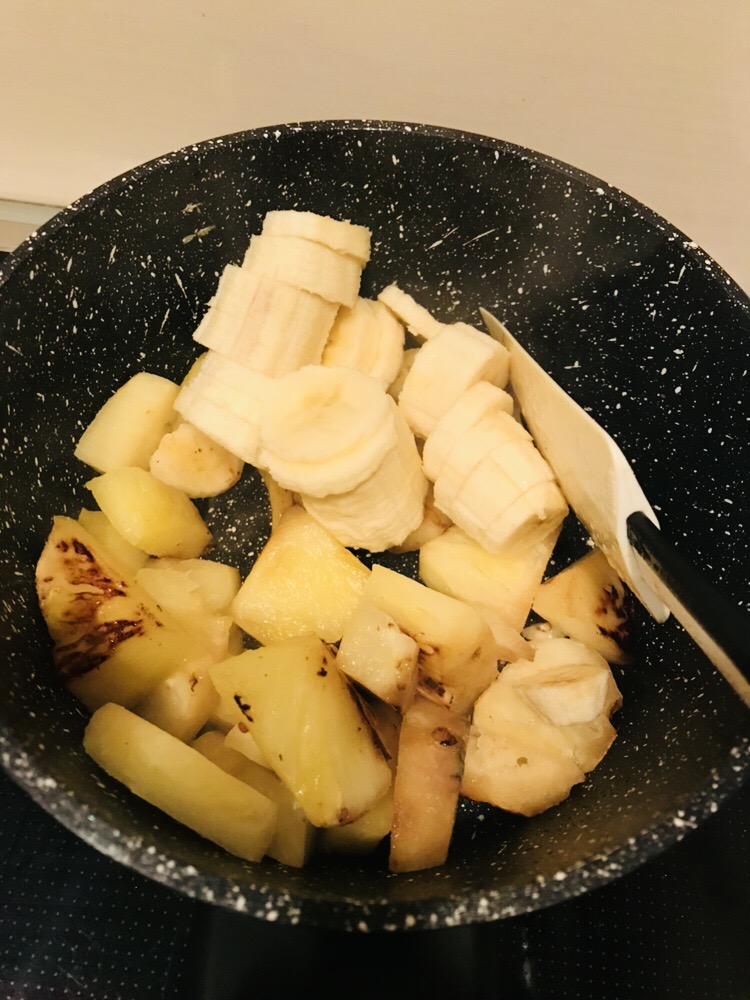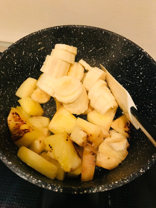 En un cazo o sartén, ponemos a calentar el aceite de coco. Troceamos la piña y el plátano en dados de 1-2 dedos de grosor y los incorporamos al cazo. Dejamos que se doren un poco poniendo el fuego fuerte.
