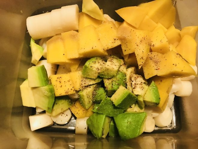 Cortamos el mango y aguacate en cuadraditos de 1-2 dedos de grosor y picamos la cebolla muy fina.