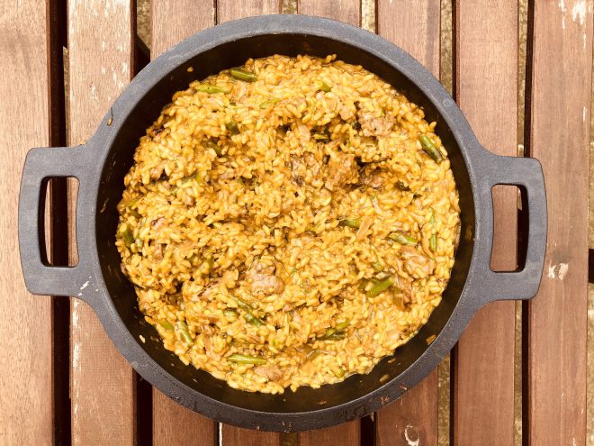 Como tantas otras recetas, este risotto me salió por casualidad… Mi intención era preparar para el arroz con judías verdes y cordero (os recomiendo muchísimo esa receta!), pero cuando fui a la compra no había judías verdes y cuando me puse a cocinar no tenía arroz normal… Total, que en lugar de las judías compré espárragos trigueros (estamos en plena época!) y en lugar de arroz normal utilicé arborio (especial risottos). Y… tacháaaaaaaaaaan, pedazo de arroz para el recetario!!!