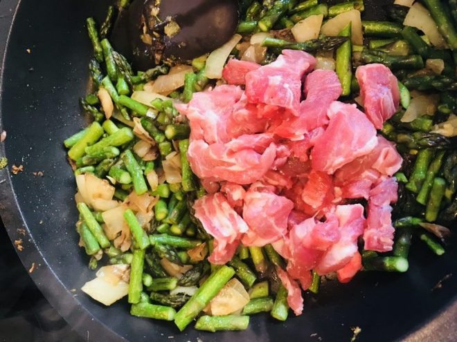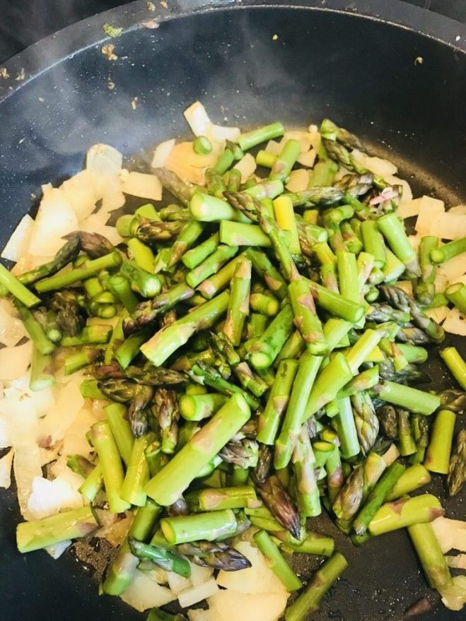 Lavamos los espárragos y los cortamos en trozos de 2 dedos aprox. Los incorporamos a la cazuela anterior.