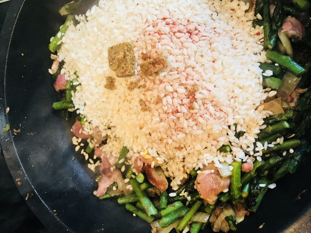 Como tantas otras recetas, este risotto me salió por casualidad… Mi intención era preparar para el arroz con judías verdes y cordero (os recomiendo muchísimo esa receta!), pero cuando fui a la compra no había judías verdes y cuando me puse a cocinar no tenía arroz normal… Total, que en lugar de las judías compré espárragos trigueros (estamos en plena época!) y en lugar de arroz normal utilicé arborio (especial risottos). Y… tacháaaaaaaaaaan, pedazo de arroz para el recetario!!!