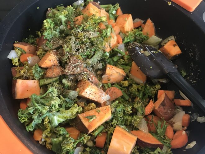 Dejamos que se cocinen las verduras con un poco de sal y las hierbas provenzales, unos 10 minutos (alternando tapadas y sin tapar).