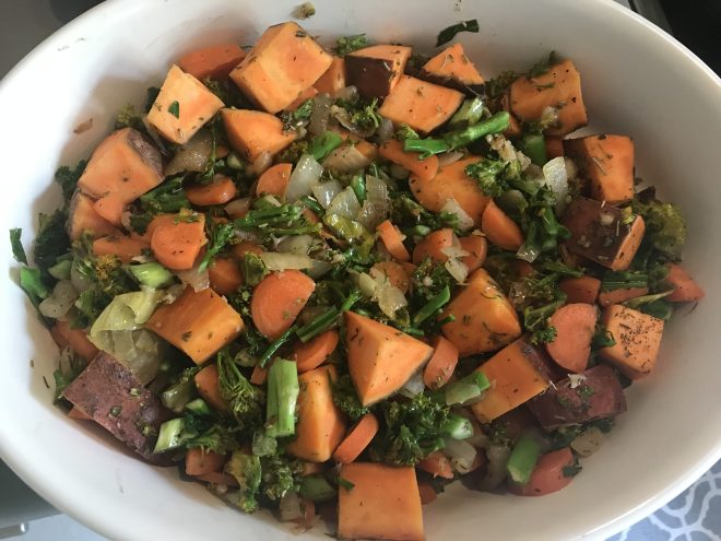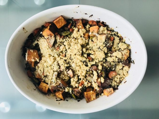 Hace poco tenía muchos restillos de verduras por la nevera y decidí darles un uso novedoso inventándome un crumble salado, por qué no? La base sería de verduras y la costrita con queso en vez de azúcar… Tenía todas las de ganar, y lo hizo! 🙂