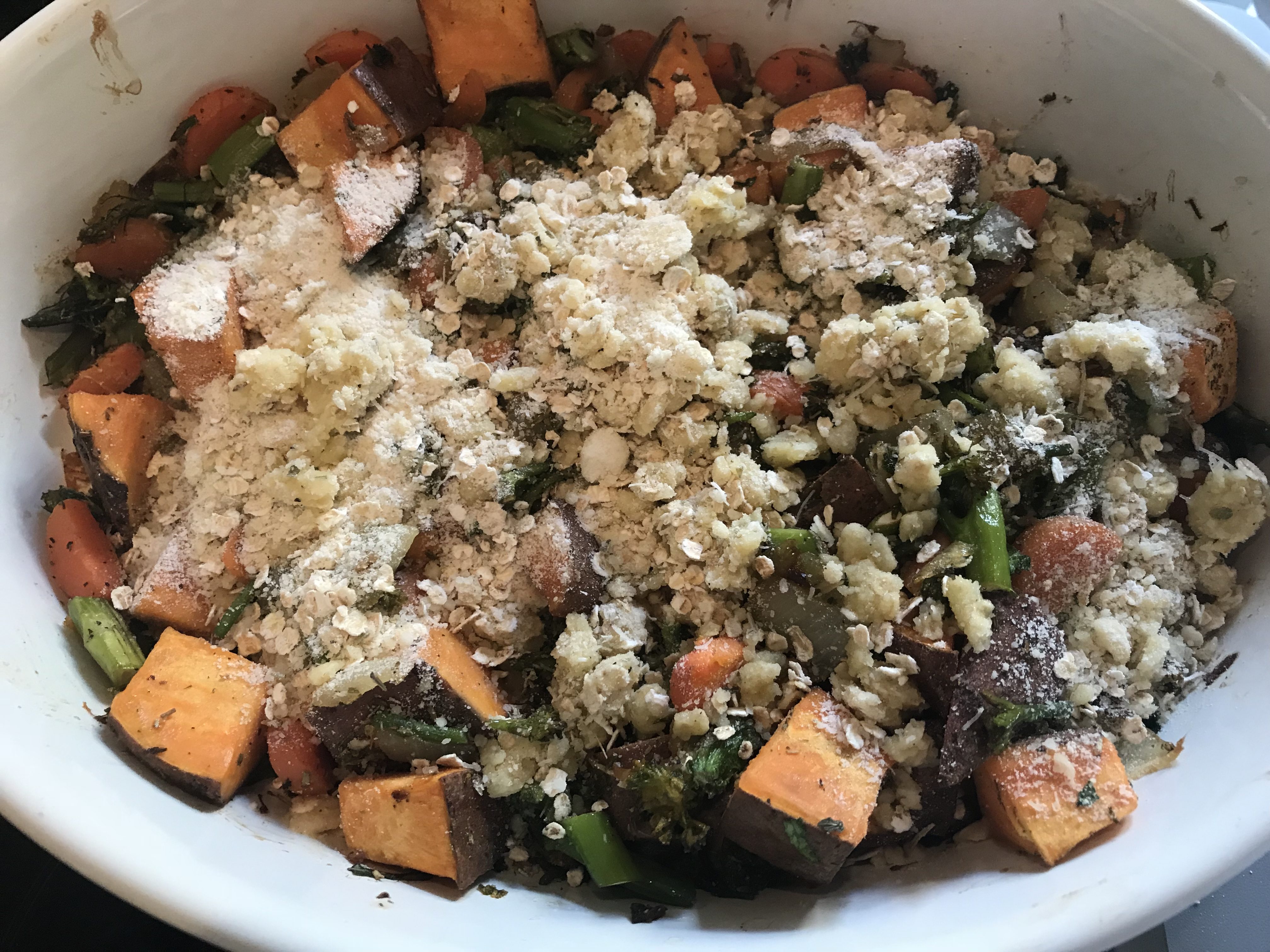 Hace poco tenía muchos restillos de verduras por la nevera y decidí darles un uso novedoso inventándome un crumble salado, por qué no? La base sería de verduras y la costrita con queso en vez de azúcar… Tenía todas las de ganar, y lo hizo! 🙂