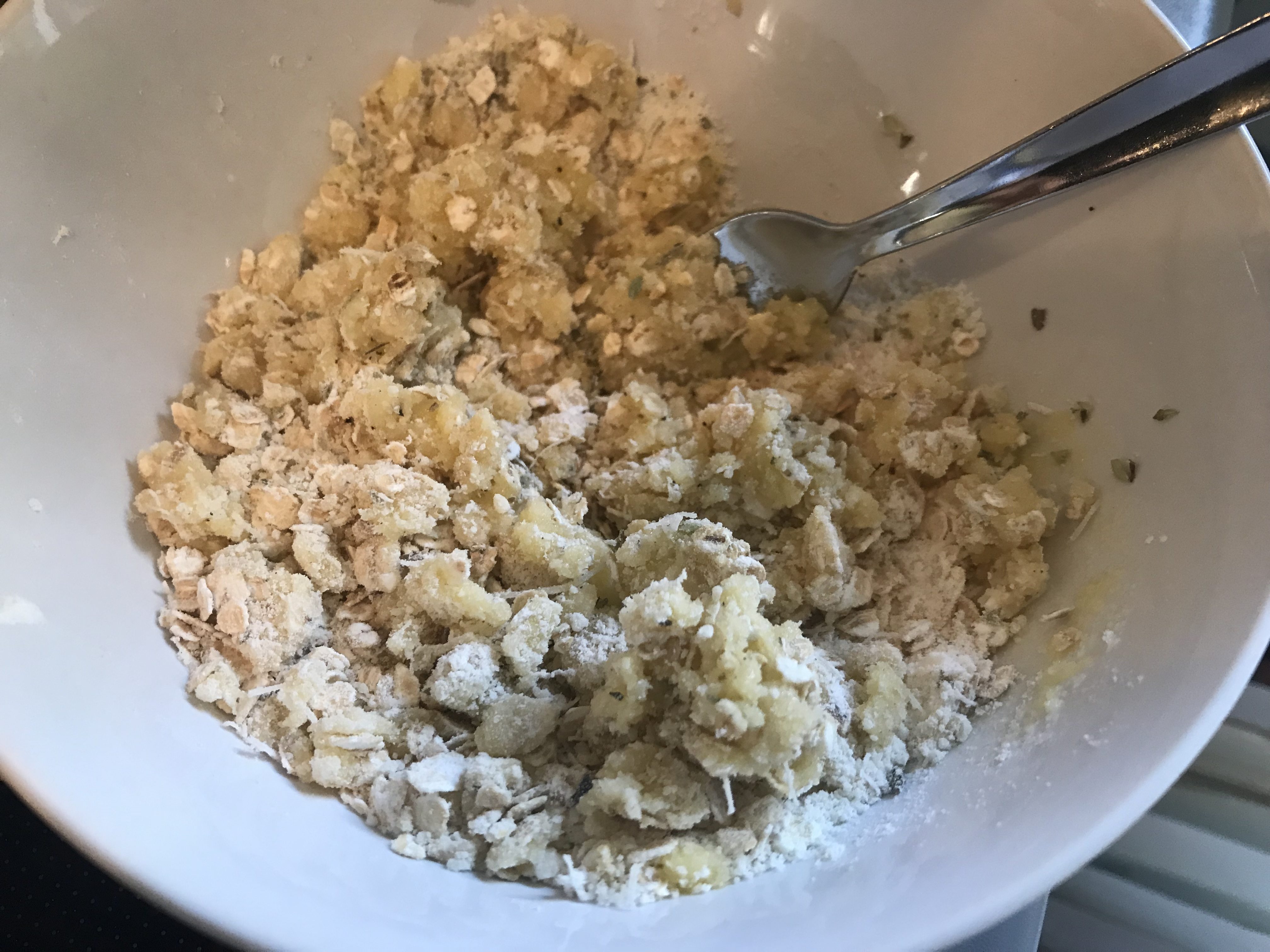 Ponemos en un cuenco los ingredientes de la costra (ver listado) y los mezclamos bien con ayuda de un tenedor. Si la mantequilla está muy dura, ablandadla antes ligeramente en el microondas, pero no dejéis que se quede líquida.